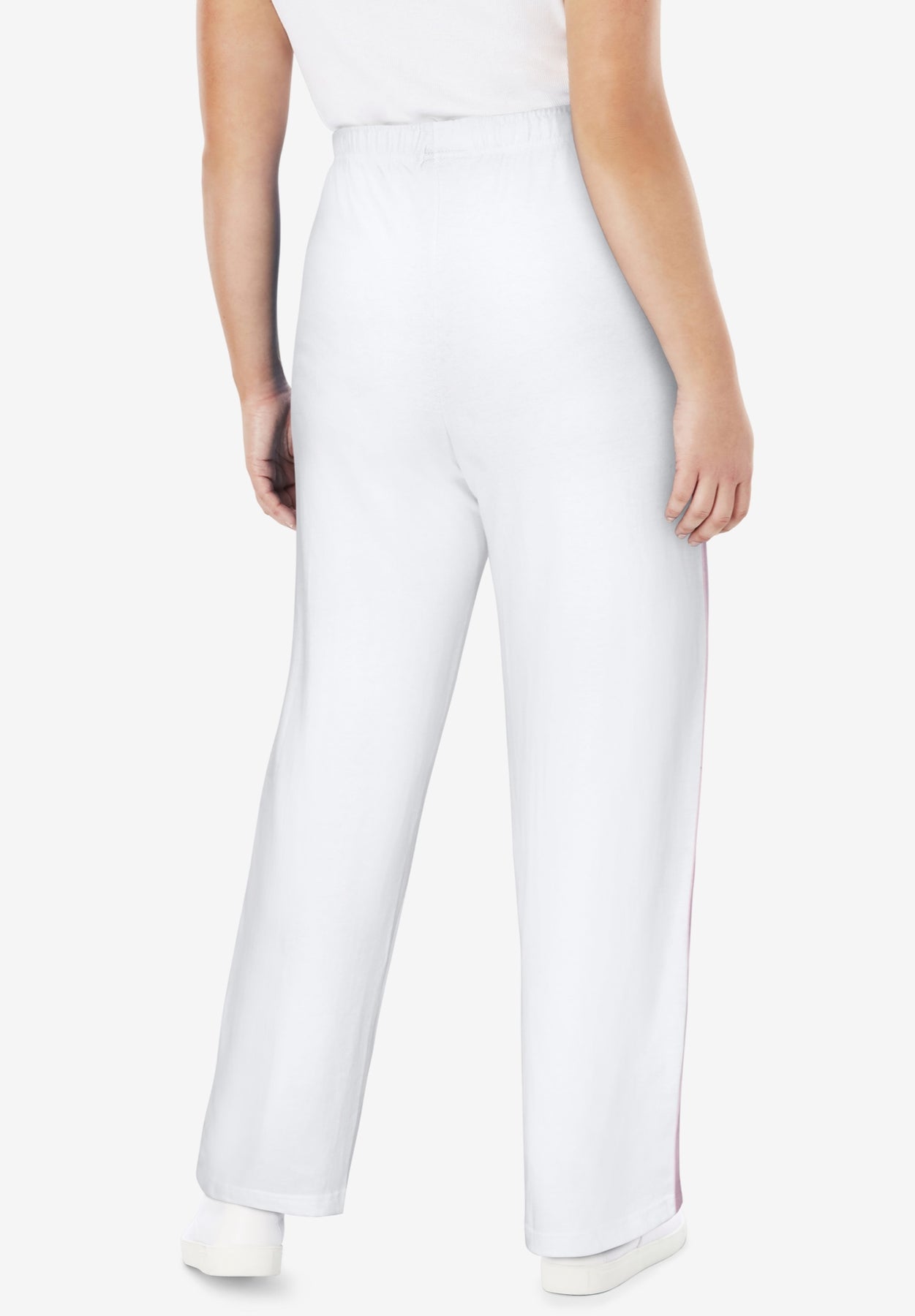 Experience ultimate comfort in these French terry pants that wick away moisture and keep you fresh all day. The full elastic pull-on waistband offers maximum stretch for a secure and comfortable fit. Convenient side pockets keep essentials handy while you're on the move. Great for running errands, walking or simply lounging at home. The inset side stripes add an elegant vertical accent.
