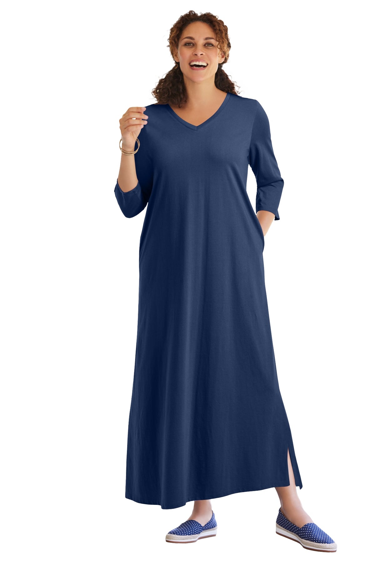 This everyday dress is a comfort staple. Flowing silhouette and easy to slip on and off! Run your errands in it or relax at home. Easy V-neckline with three-quarter sleeves. This tee dress is perfect to wear all year around!
