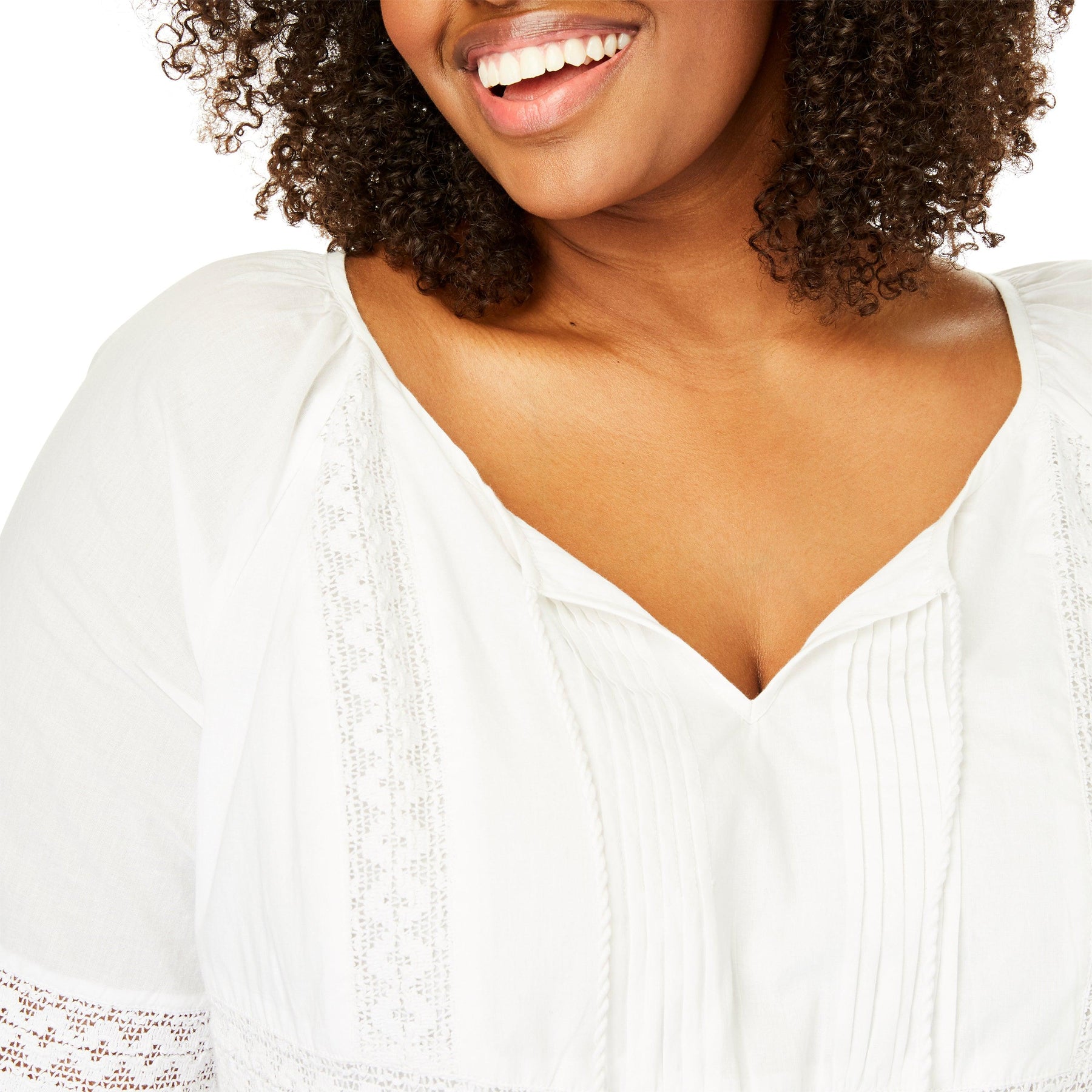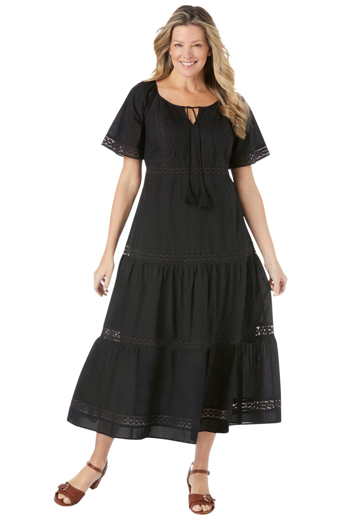 Dress up casual moments in this lightweight, cotton-lined style, highlighted by crochet detailing and tiers. Flutter sleeves and a tiered skirt add pretty details to an everyday style.