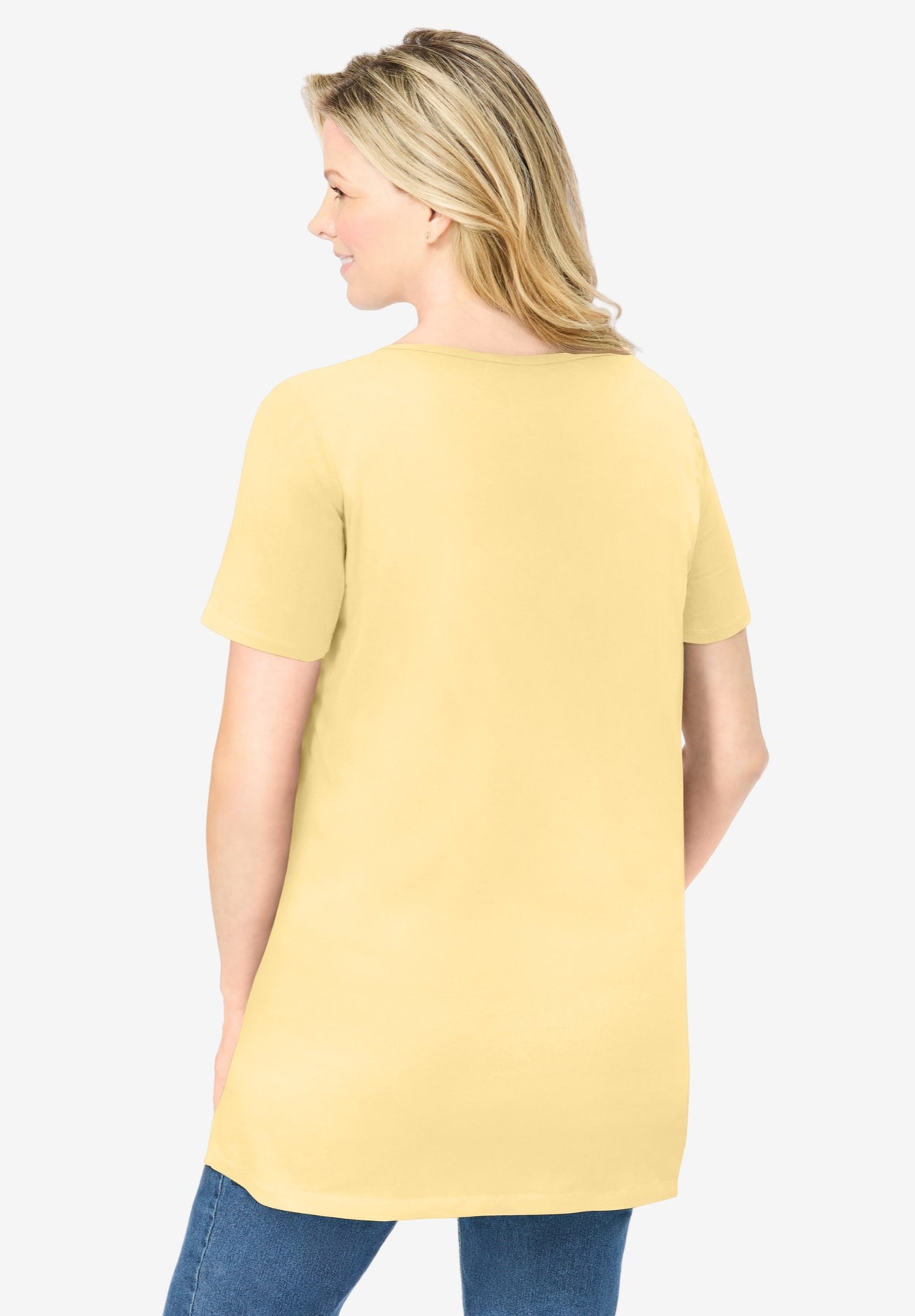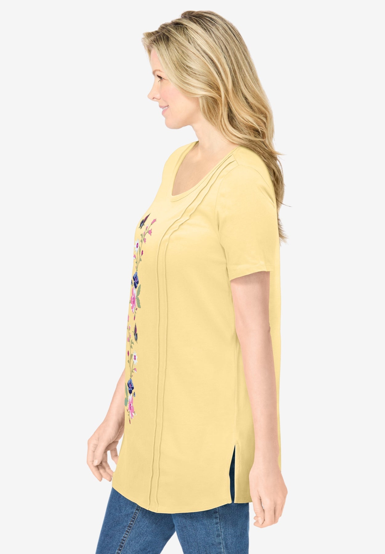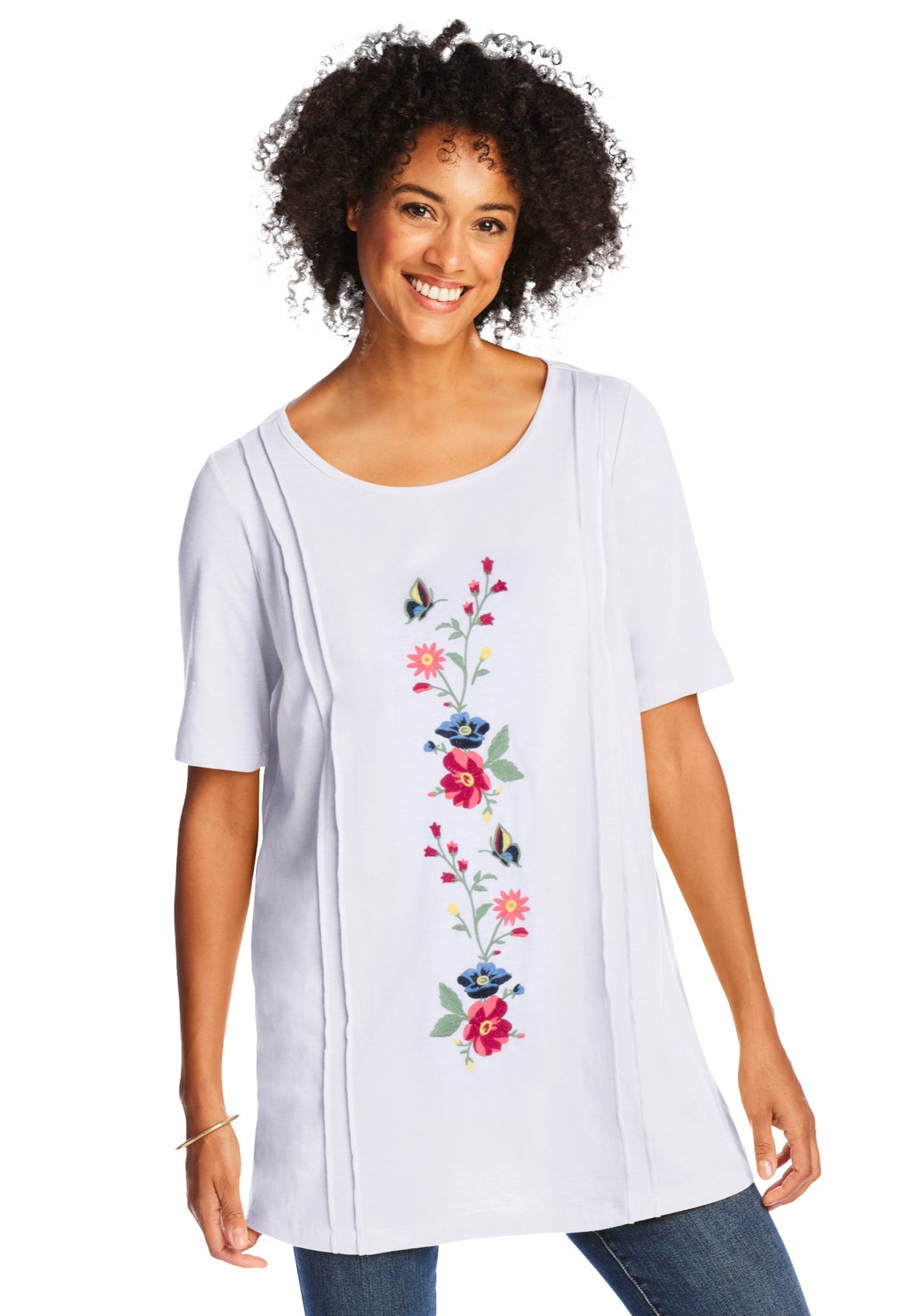 A relaxed fit short-sleeve scoop neck with embroidery. Side pintucks details with a straight hem. 30" length.