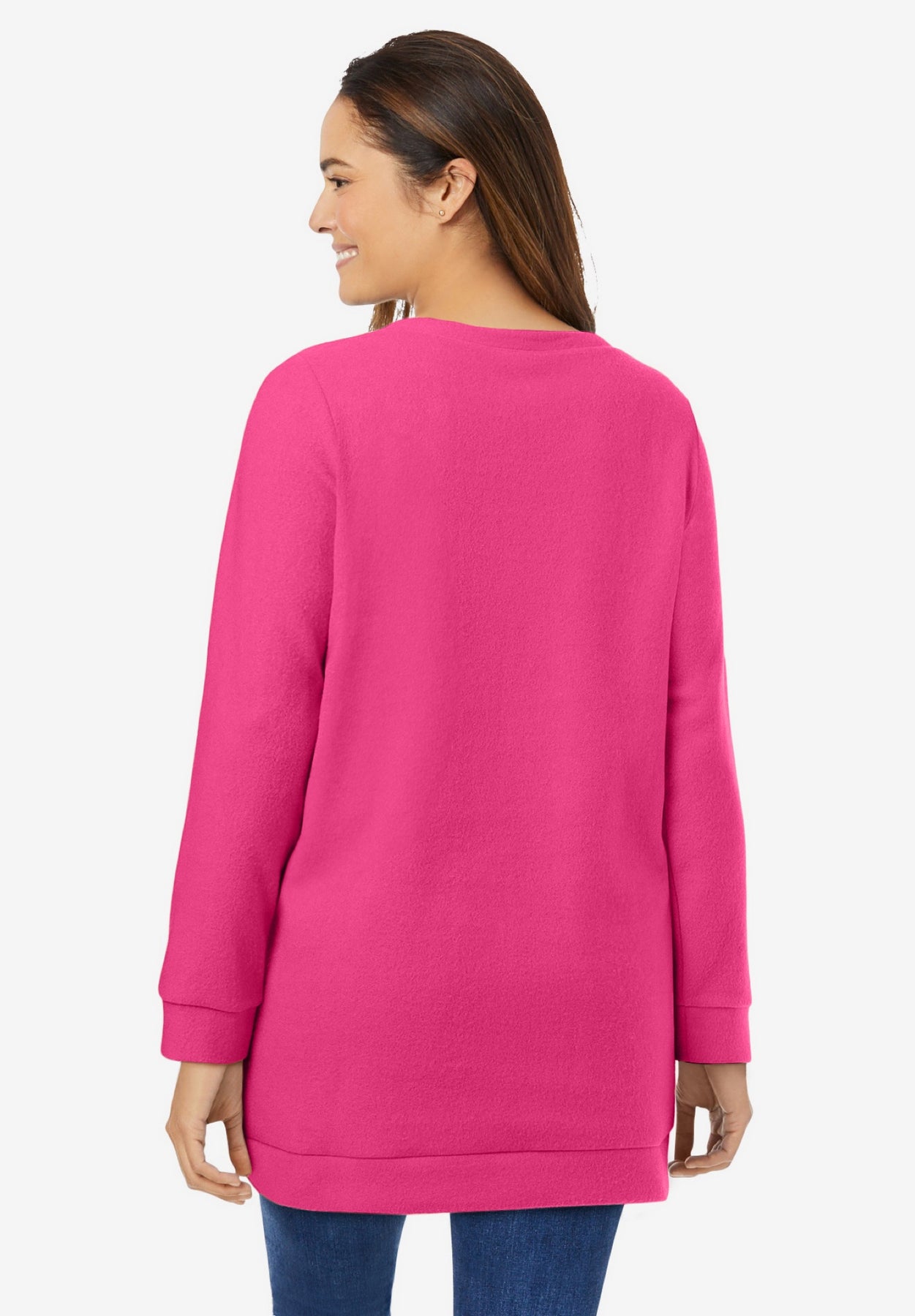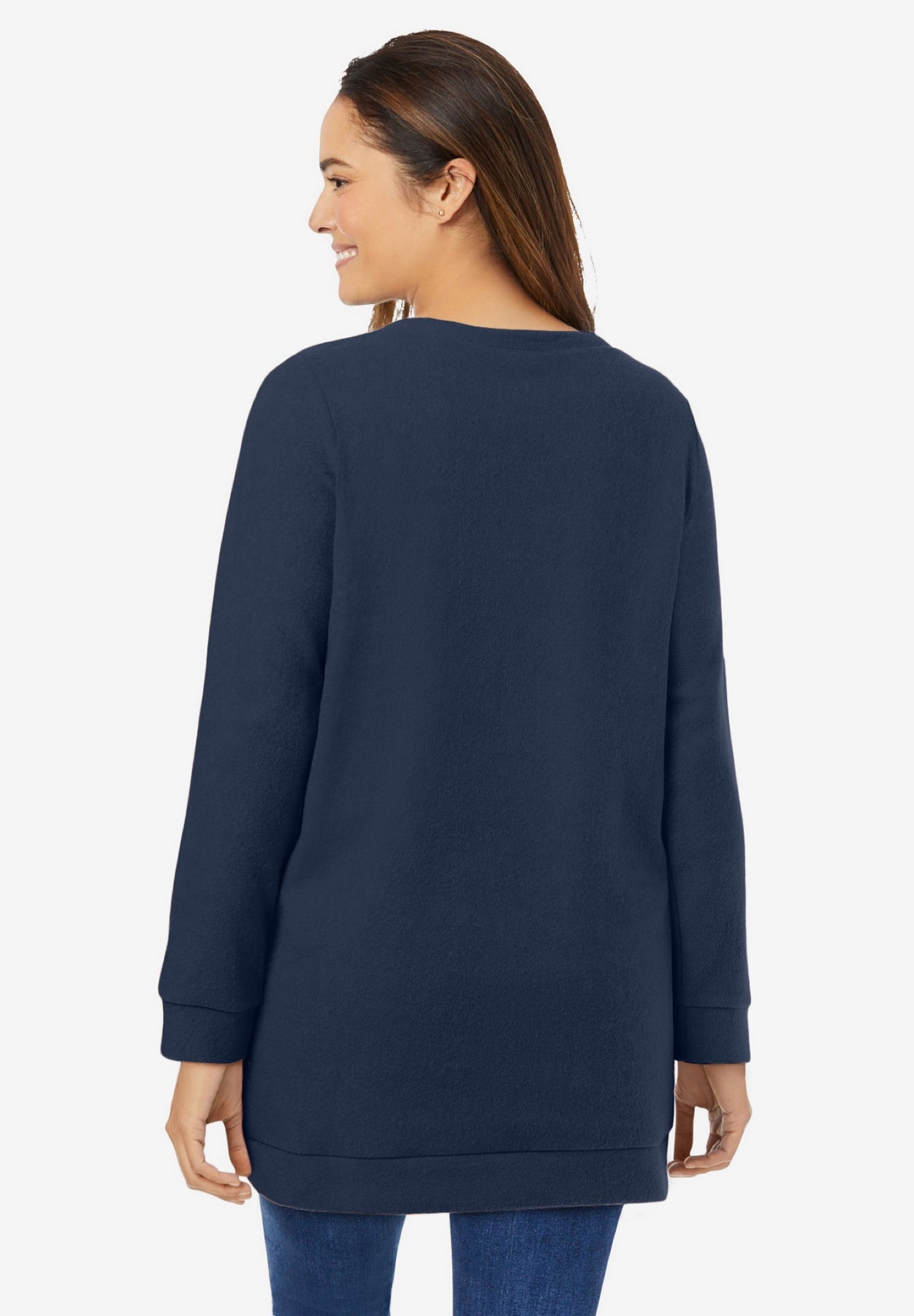 Our plush sherpa sweatshirt tunic has the softness you love with the coverage you want. It has a flattering V-neckline, roomy front pockets, and an easy relaxed fit.