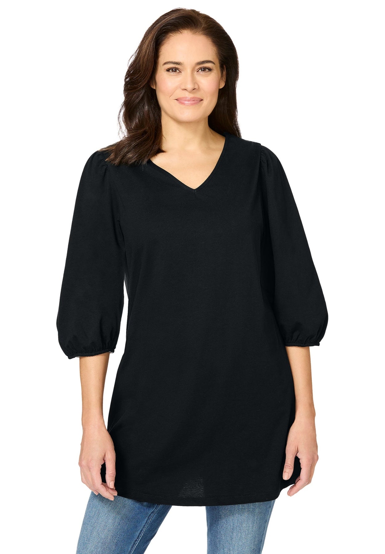Twice as nice! This reversible neckline tunic has two tops in one! Wear it on its V-neckline side or reversed scoop neckline. Easy swing silhouette. Pretty blouson sleeves with elastic cuff sleeve.