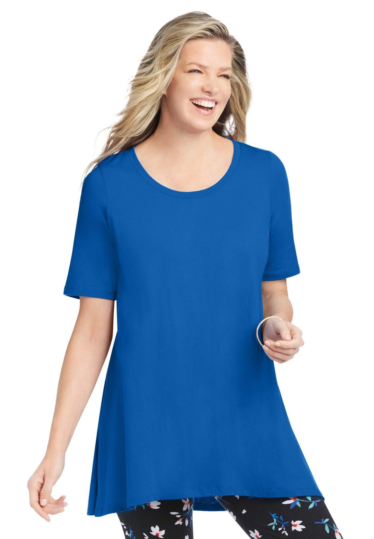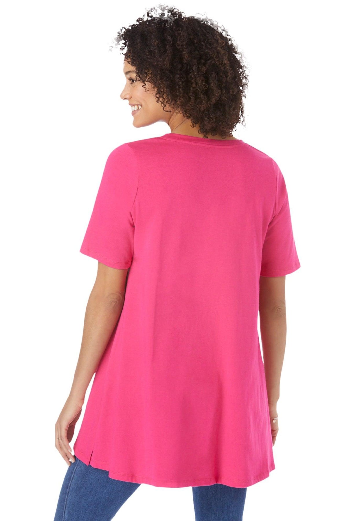 This V-neck style tunic has a breezy and relaxed fit. Three-quarter sleeves cover the arms but allow for easy movement, and a longer tunic length hits perfectly at the upper thigh for coverage.