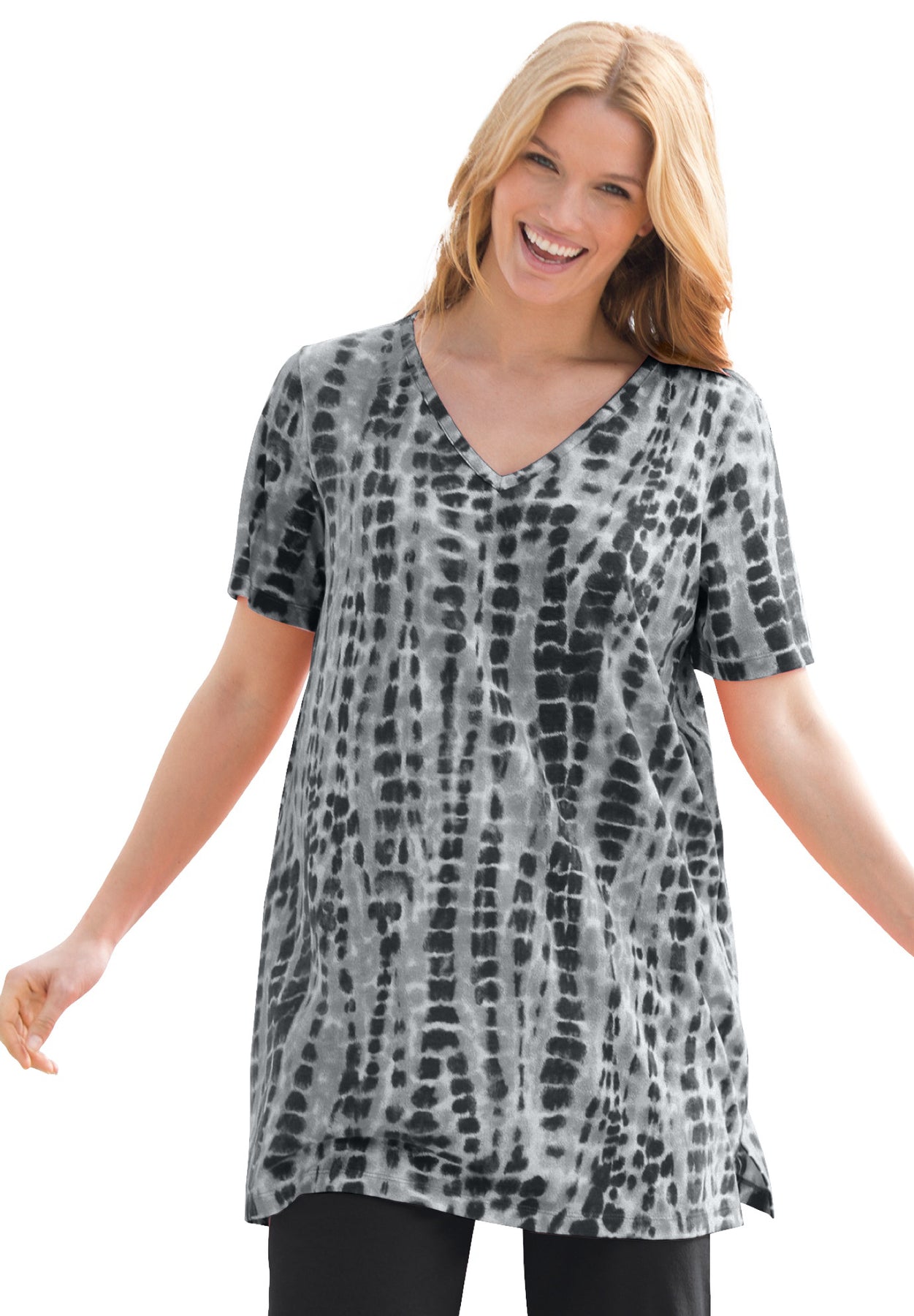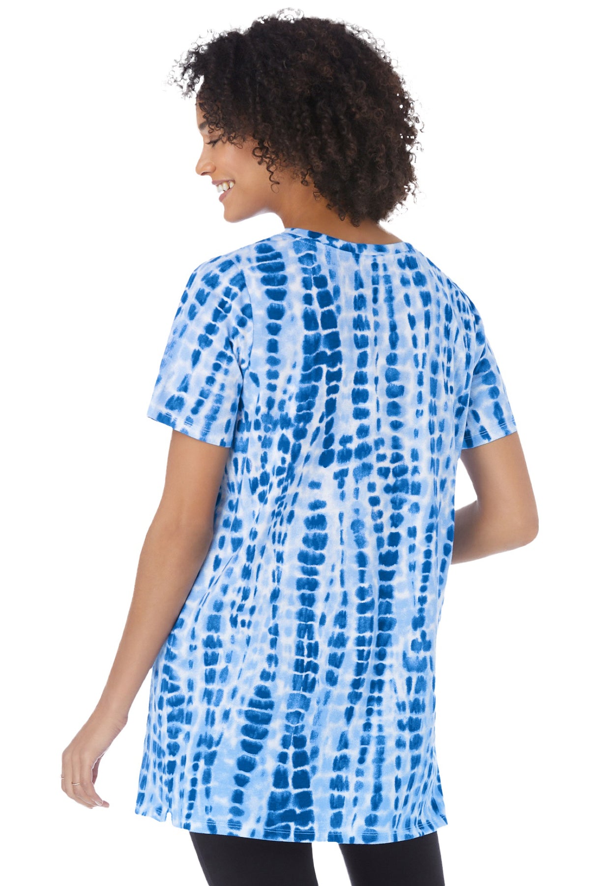 A classic shape with a flattering V-neck, this Tie-Dye Tunic will become a staple in your wardrobe. Elbow sleeves and a longer hem length provide perfect coverage.