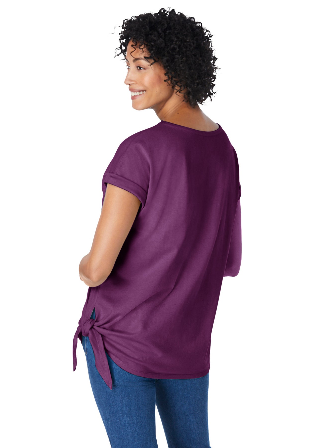 Smooth V-neck jersey tee has a cute side tie and cuffed short sleeves.