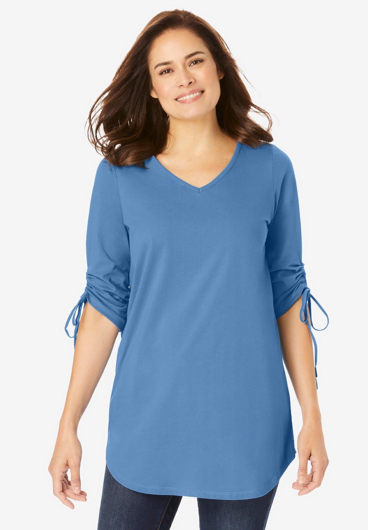 Pull-on and go with this beautiful three-quarter set-in sleeves tunic! A must have for your closet with a tie on side to adjust to your liking. A v-neckline with shirttail hem for a relaxed fit. This tunic is perfect for a lunch with friends to dinner with your family.
