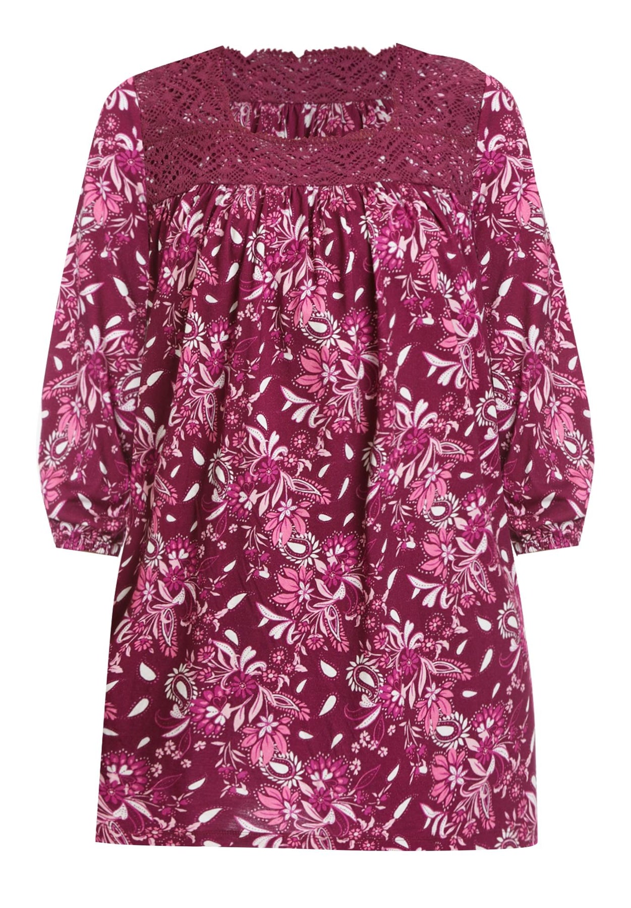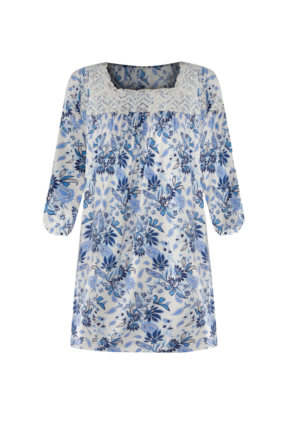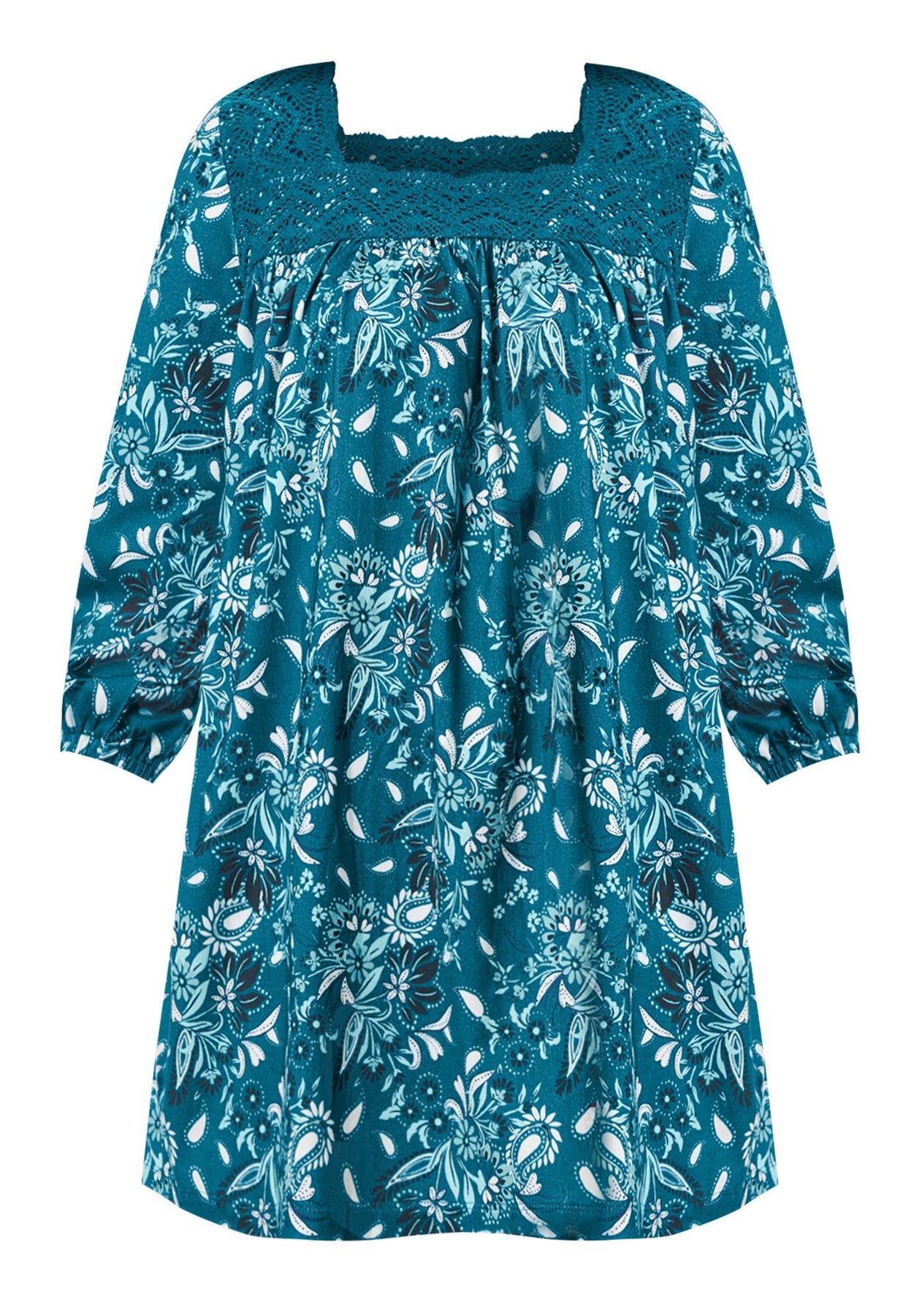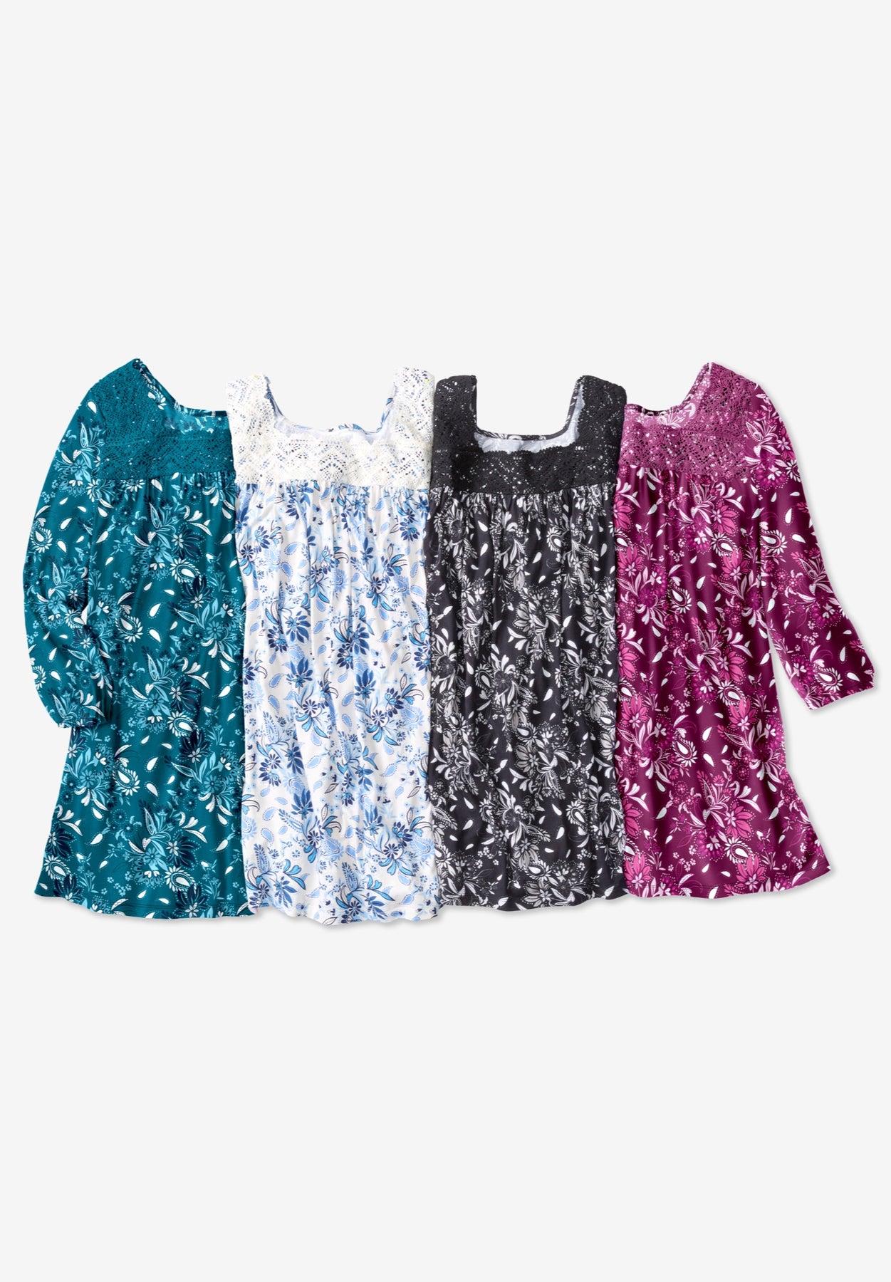 This A-line tunic is color and comfort at their best. It has a flattering square neck with pretty lace trim and ruching on the front bodice and the longer length gives it the perfect amount of coverage.