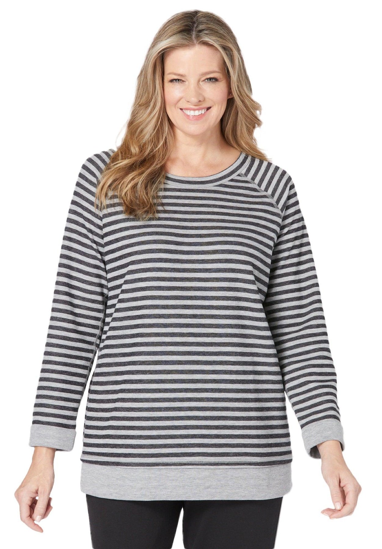 This must-have sweatshirt is reversible with playful prints and marled sides. Easy scoop neck with raglan sleeves and turn-back cuffs. Straight hem with 30" length.