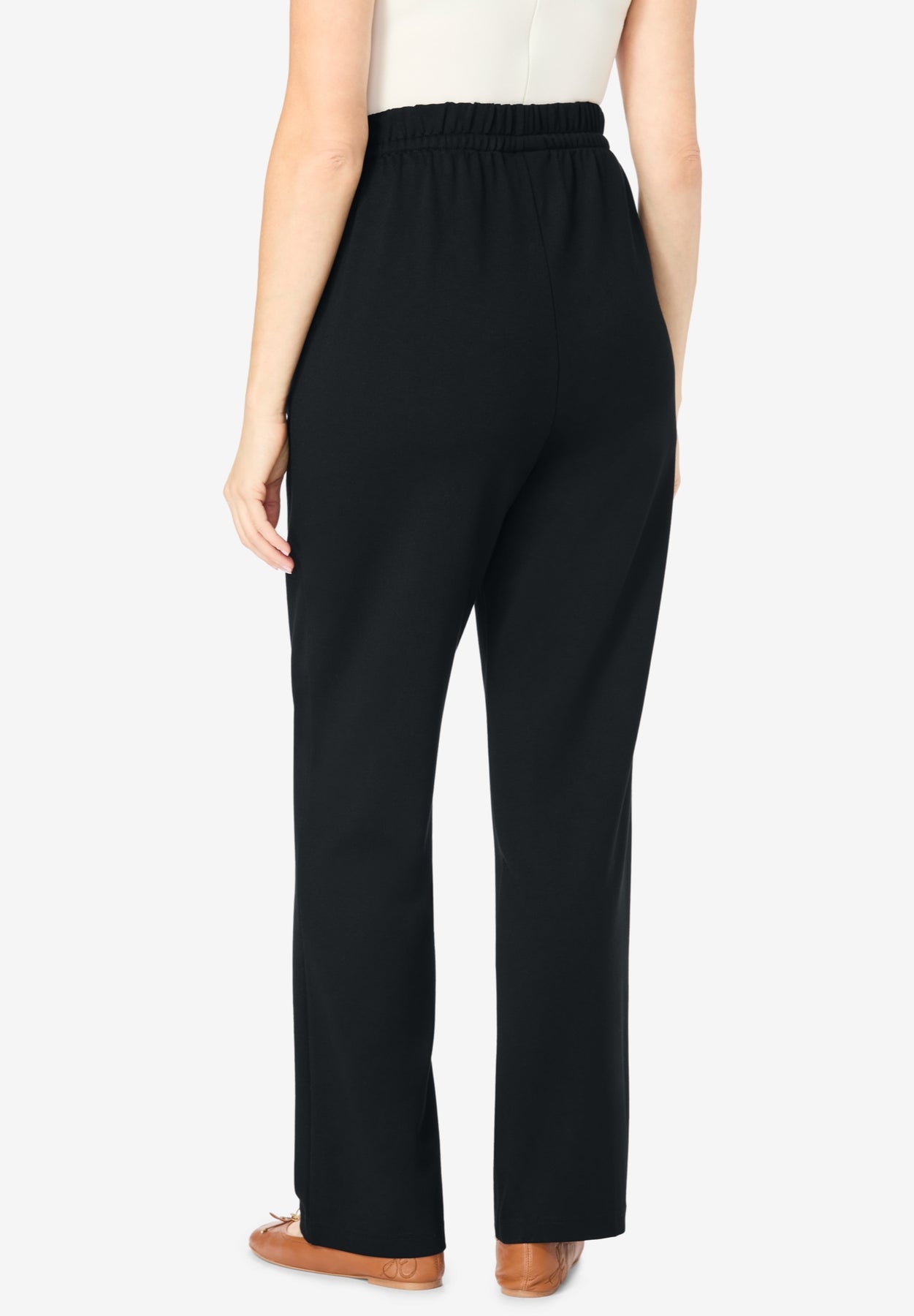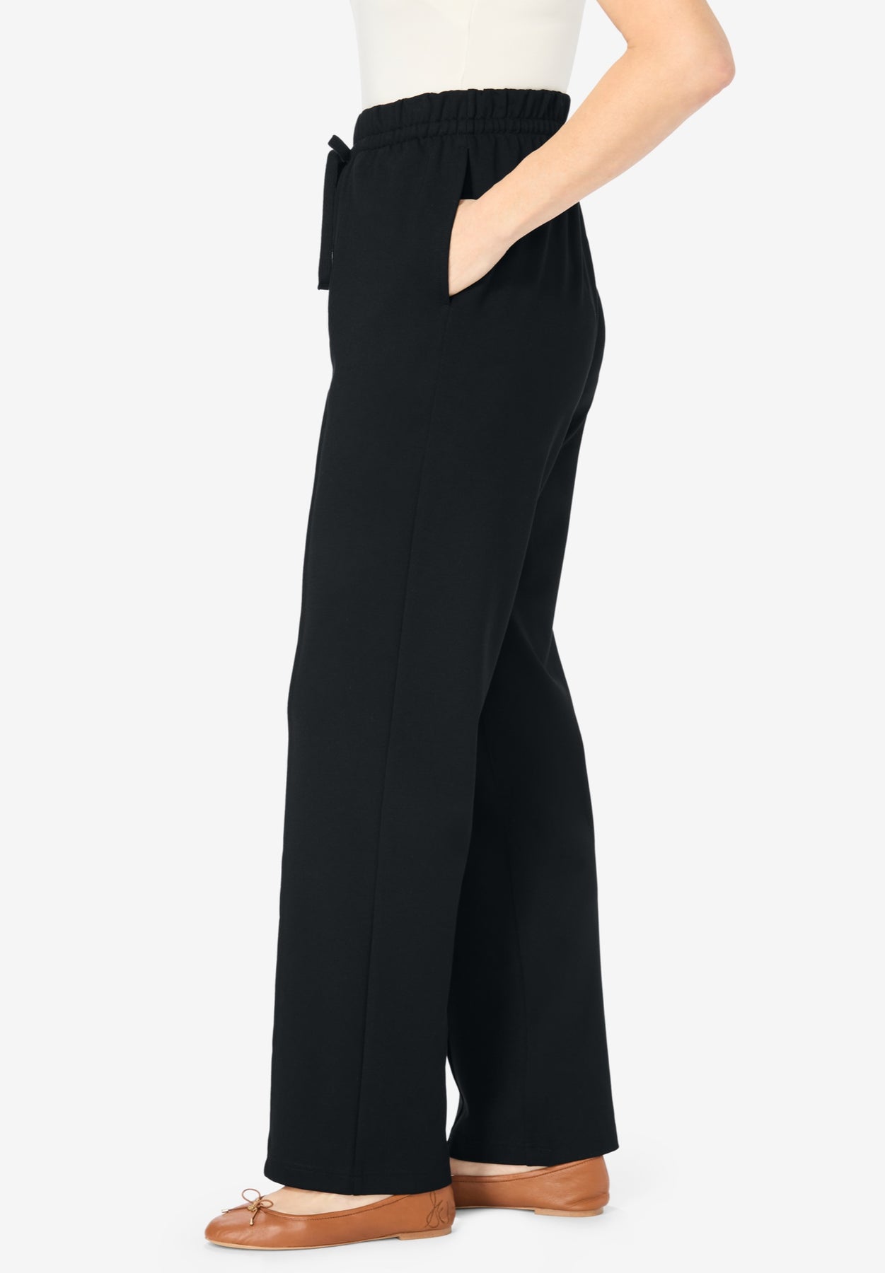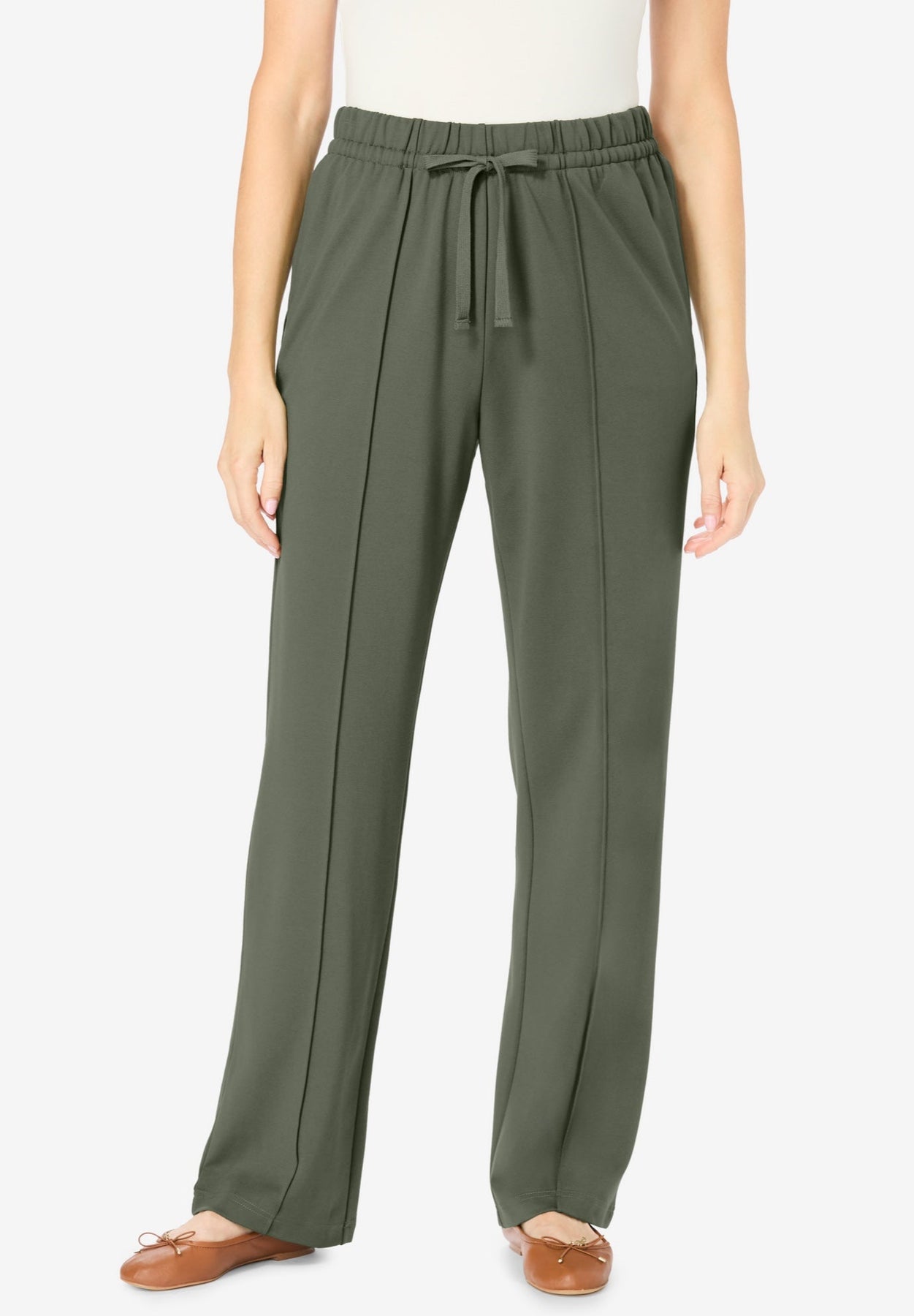 Relaxed fit knit pants with side seam pockets. Full wide covered elastic waistband for pull-on comfort. Adjustable drawstrings for a custom fit. Sit above the waist for all-day comfort. The front pintucked crease lines add elegant vertical accents.