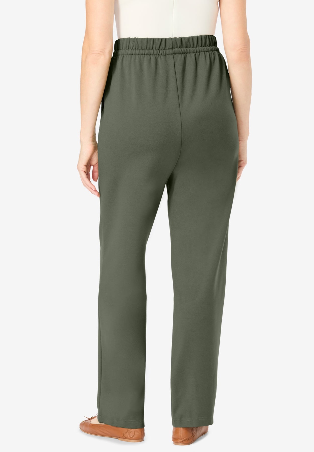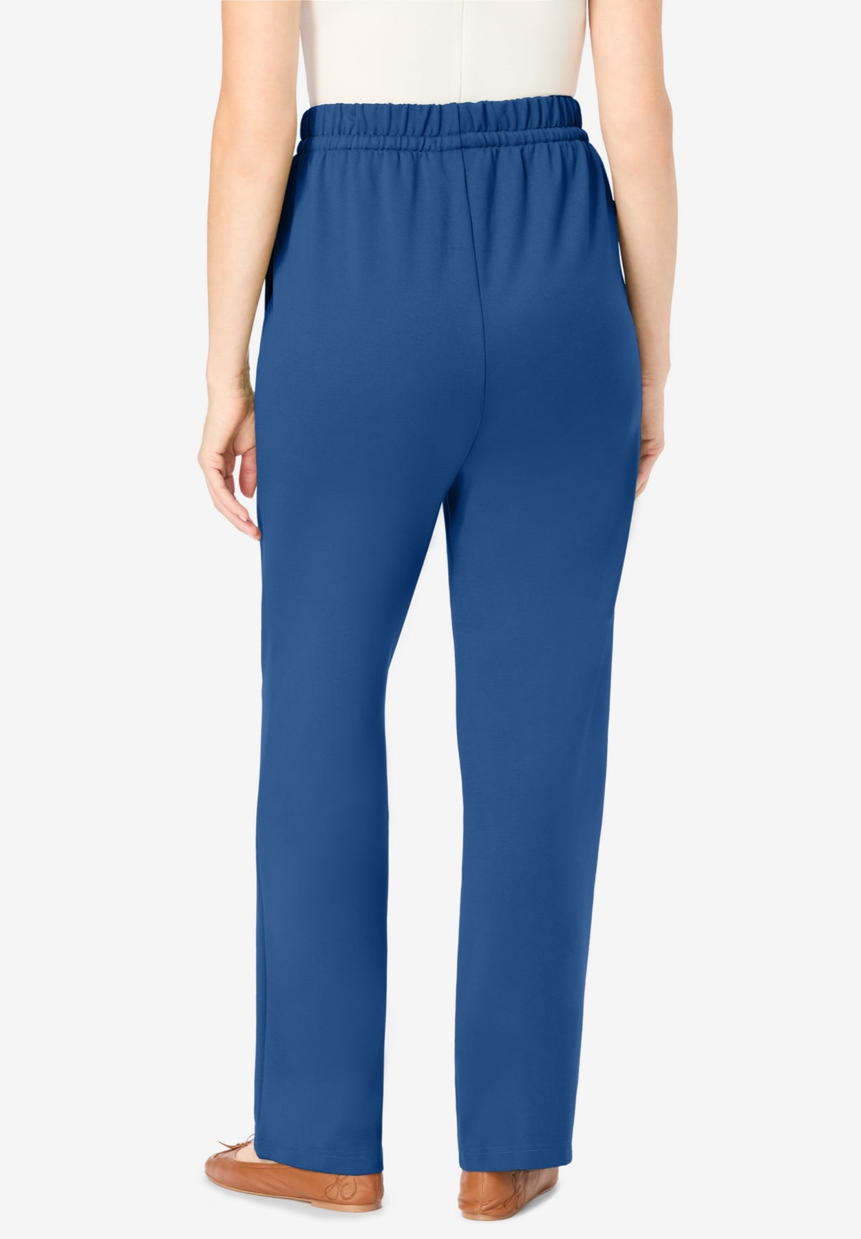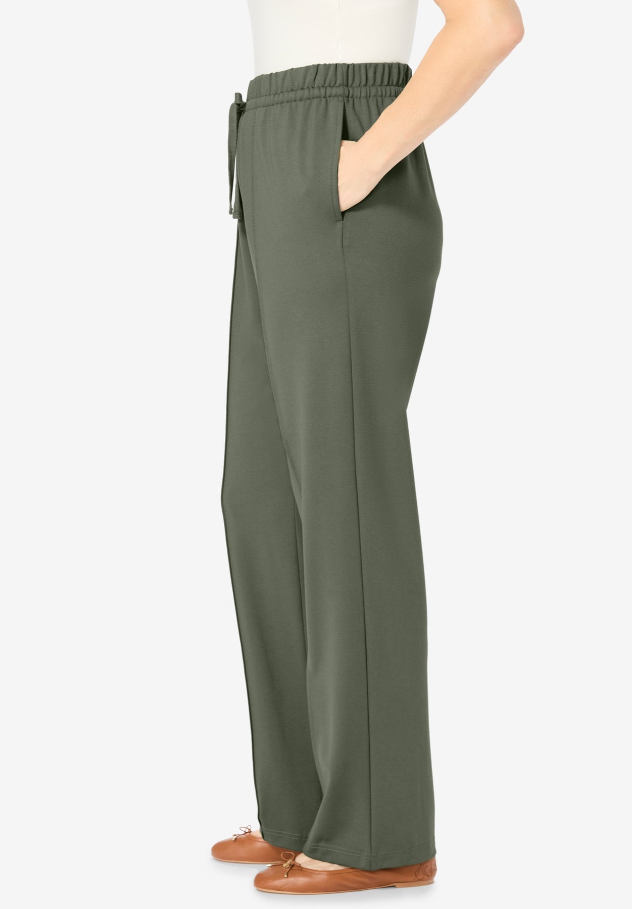 Relaxed fit knit pants with side seam pockets. Full wide covered elastic waistband for pull-on comfort. Adjustable drawstrings for a custom fit. Sit above the waist for all-day comfort. The front pintucked crease lines add elegant vertical accents.