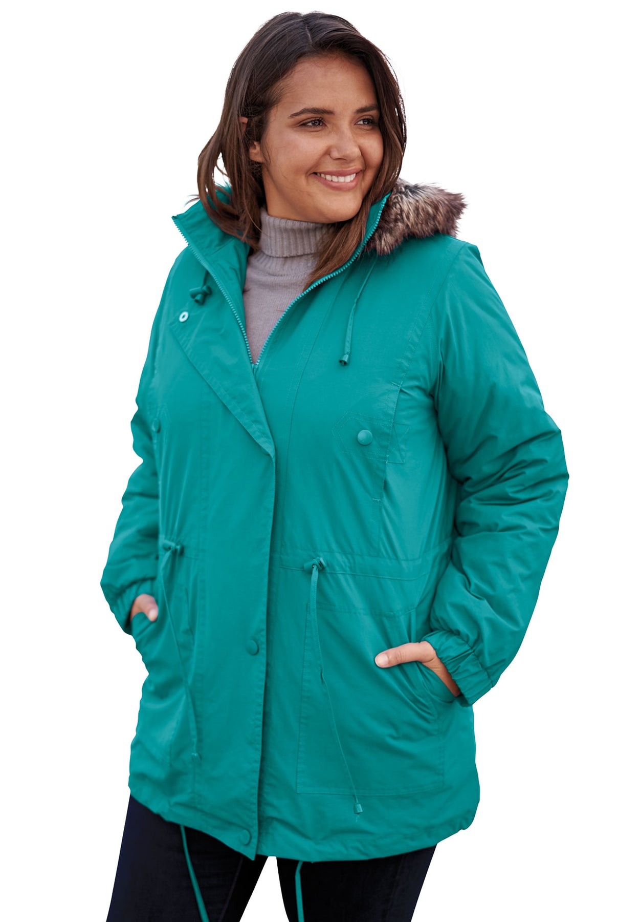 - Detachable hood with faux-fur trim for extra warmth and style.