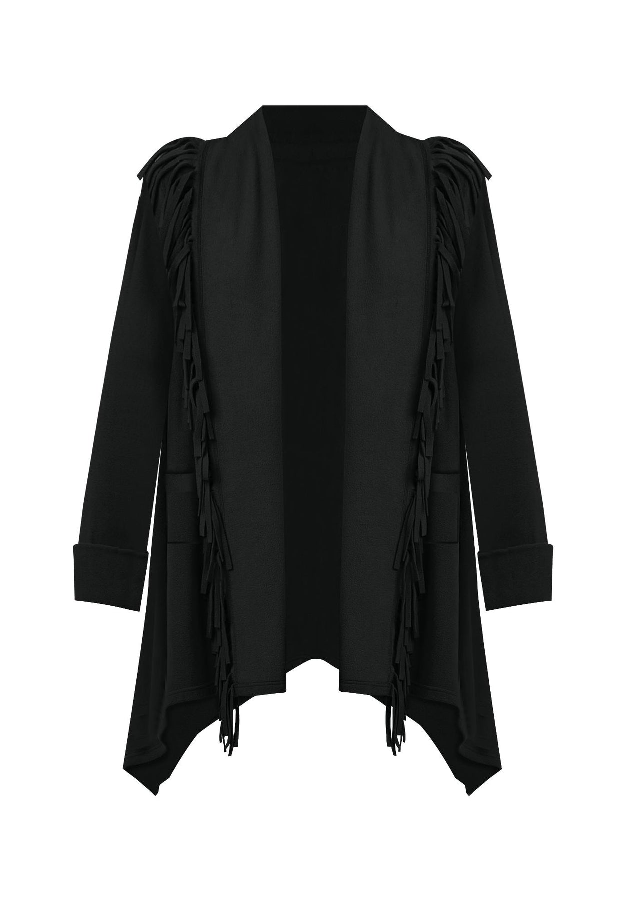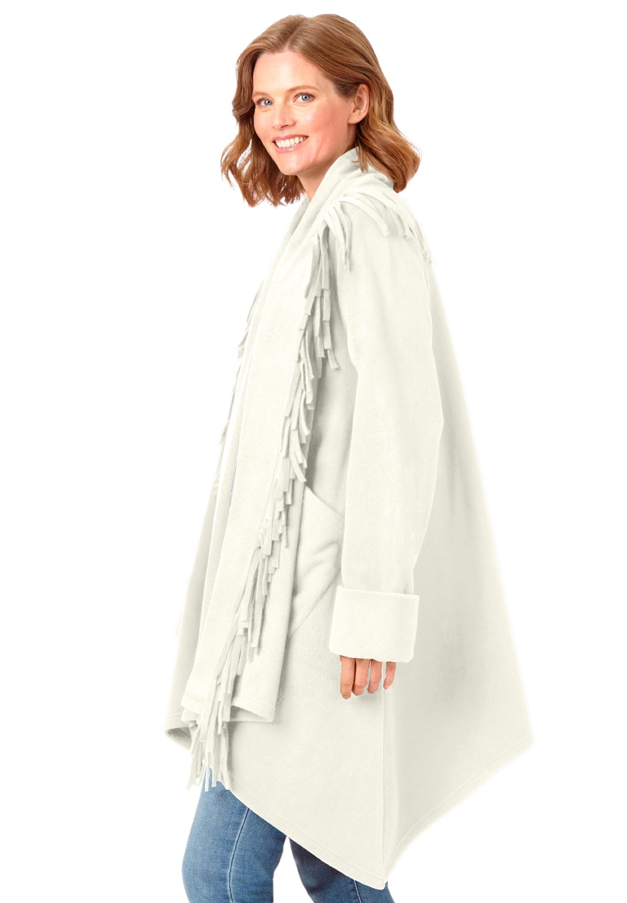 From the cozy, soft fabric to the fringe trim, we know you will be thrilled with this snuggly fleece jacket. An open shawl collar is adorned with fringed edges that add a little fun. Patch pockets on the front offer a comfy place to keep your hands and your daily essentials.