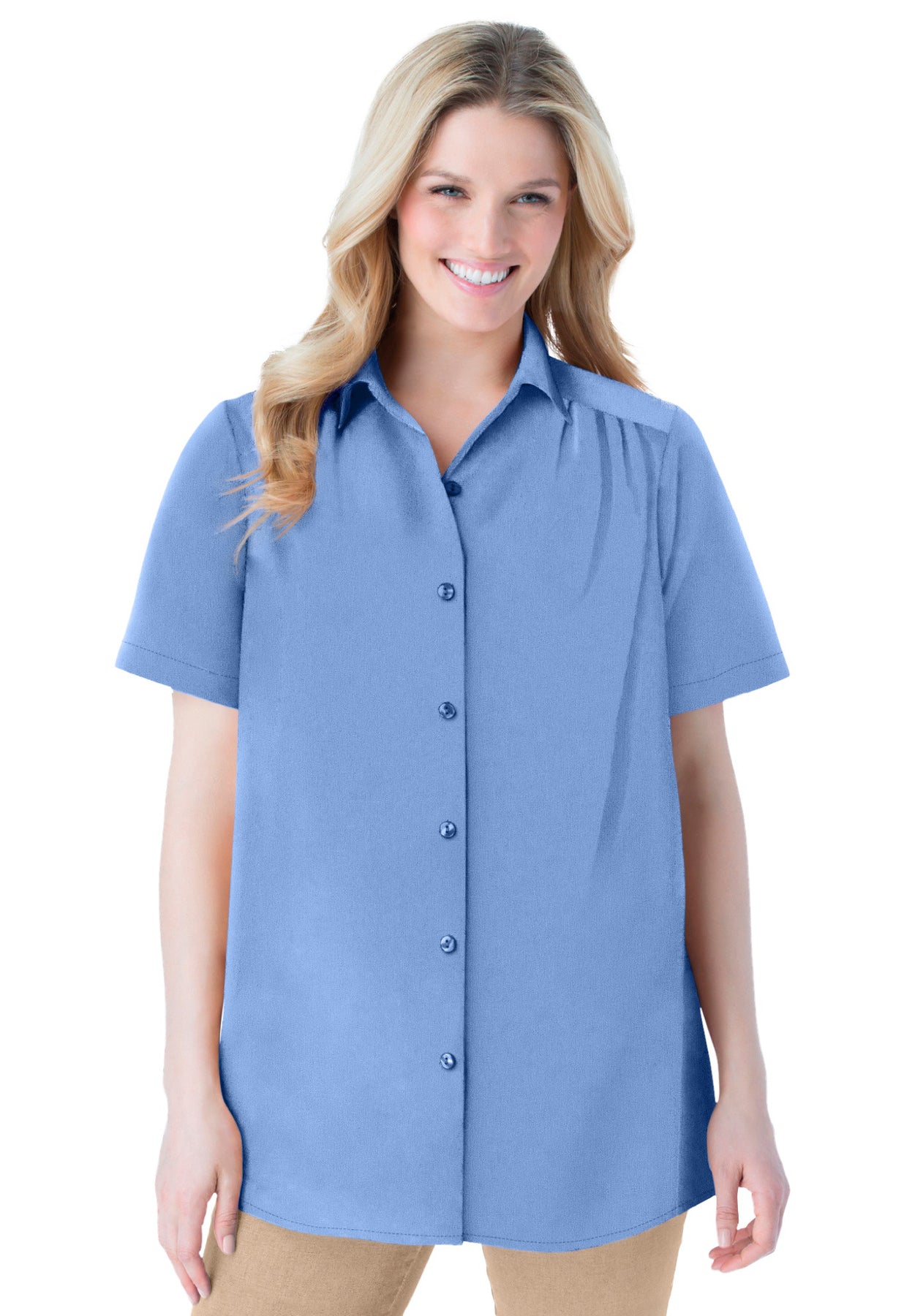 This short-sleeved button down has a generous fit and a soft-as-silk feel. Front and back shirring creates extra room for movement, and a spread collar allows it to open up for your comfort.