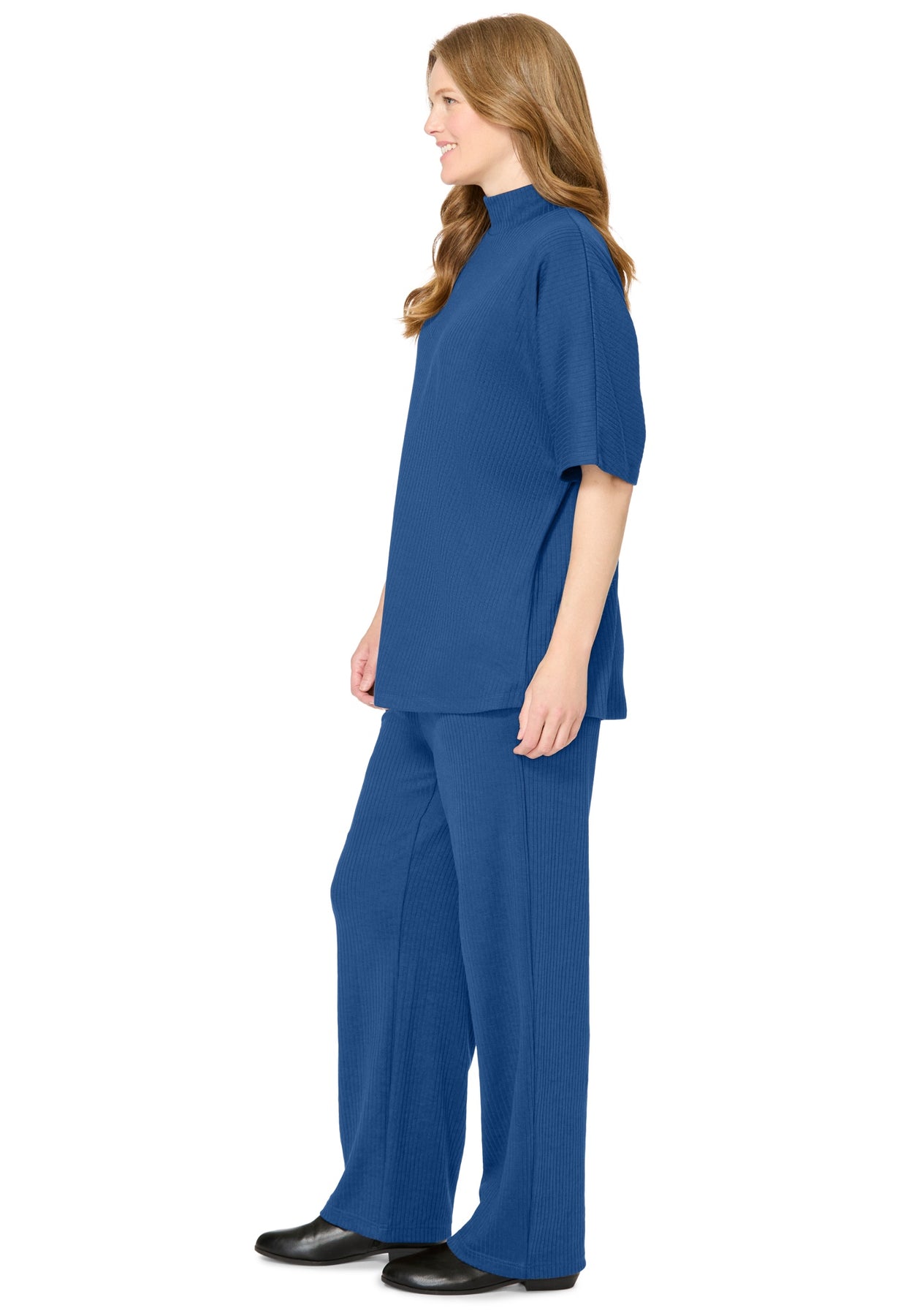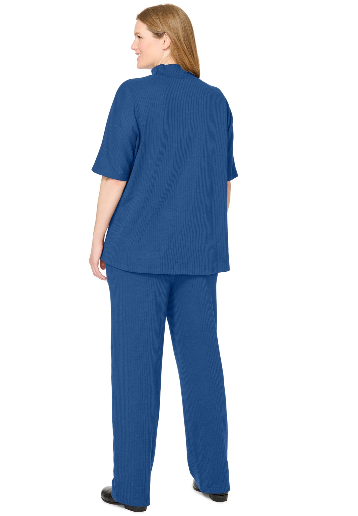 Your favorite rib knit, is now a tee and pant set! Relaxed rib tee has mock neckline with elbow length dolman sleeves. Lounge around in this set or run errands. Ribbed wide-leg pants have all around elasticized waist with side pockets.