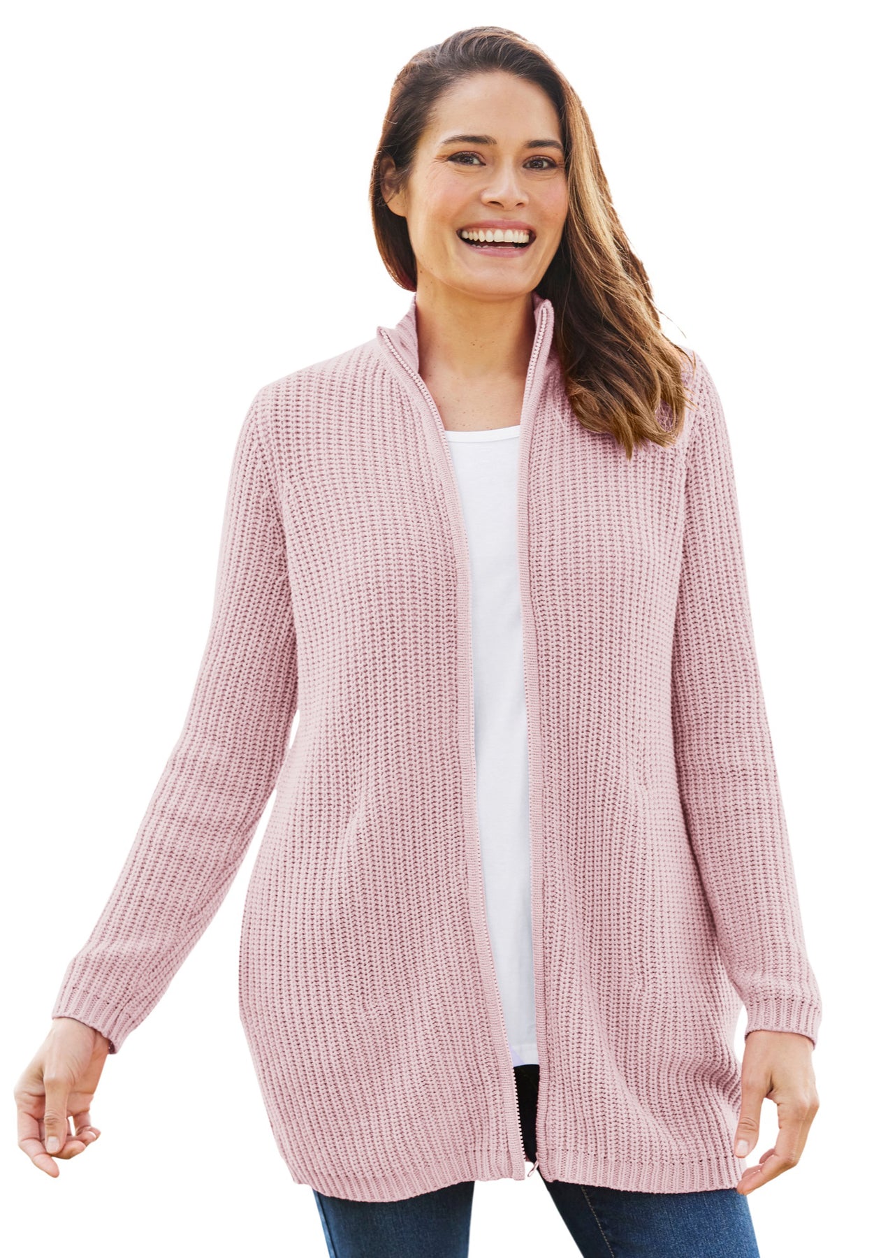 This shaker stitch cardi has cozy covered. A mock neck can be zipped up to keep you nice and warm. Layer it over your tops and tees when you need an extra layer of warmth.