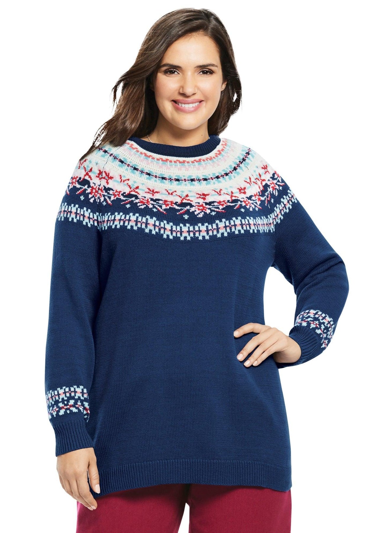 A colorful Fair Isle pattern at the neckline and sleeves of this easy pullover sweater adds a festive touch. Made in a relaxed fit, it’s the piece you’ll pull on whenever you want to add a little color to your winter outfits. Designed with a rib knit hem and sleeve cuffs.