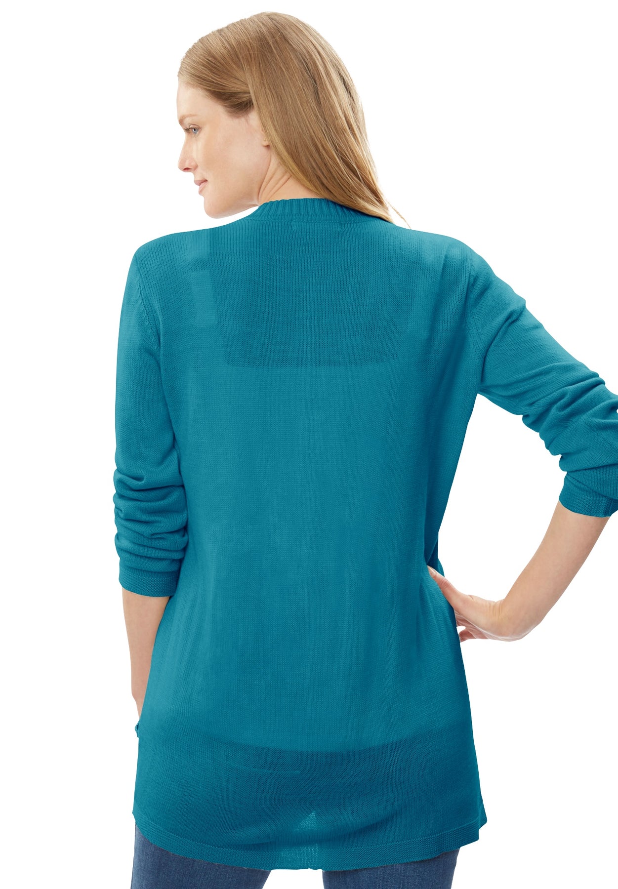 This airy knit cardigan has pretty open pointelle details that add a delicate and feminine touch to a classic style. A button front can be worn open or closed, creating a lovely layer that shows a peek of your shirt. Solid knit back.