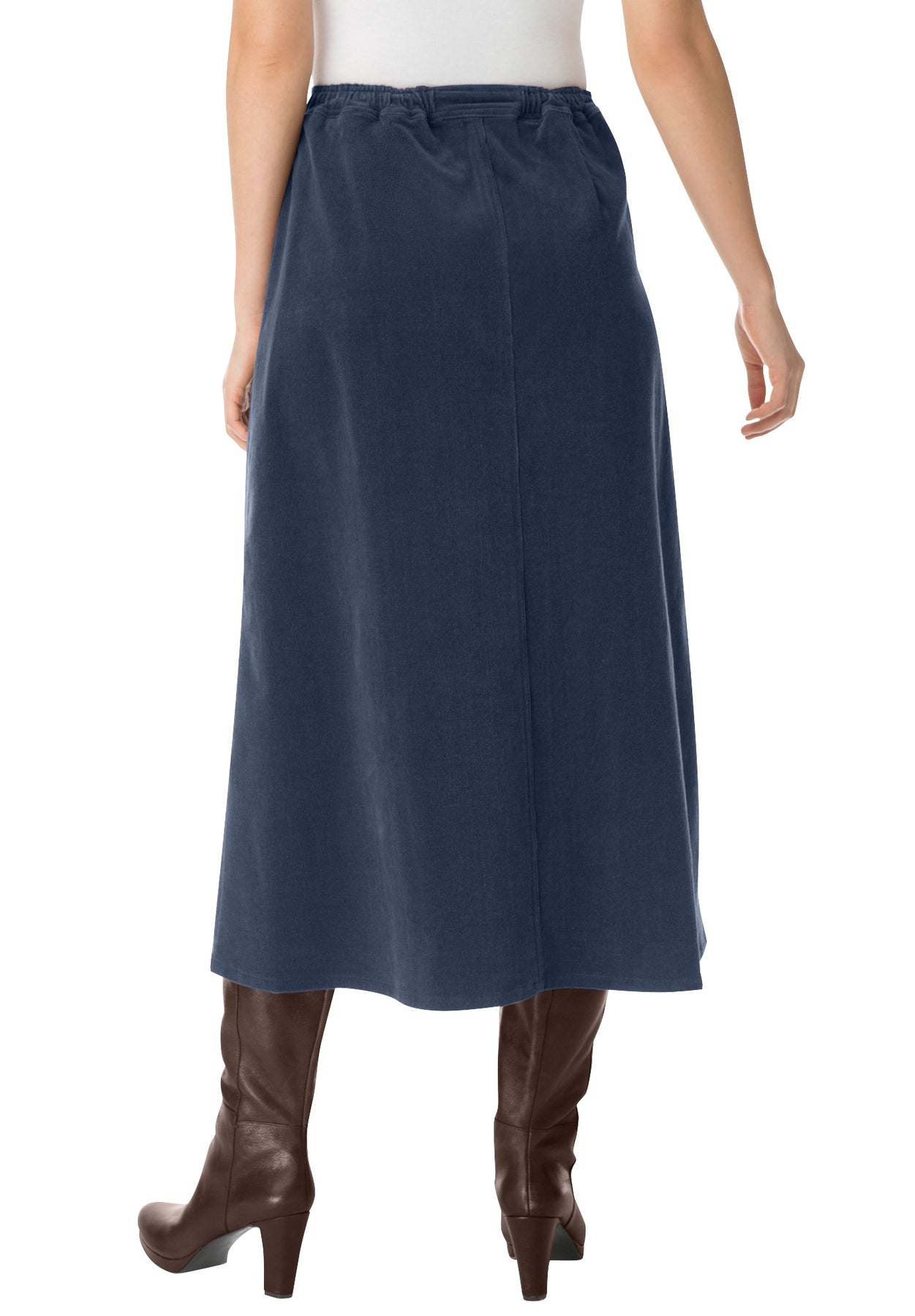 This plus size corduroy skirt can be be paired with your favorite tops and sweaters. With great details such as slant pockets and a supremely comfortable side elastic waist, you will be comfortable all day long.