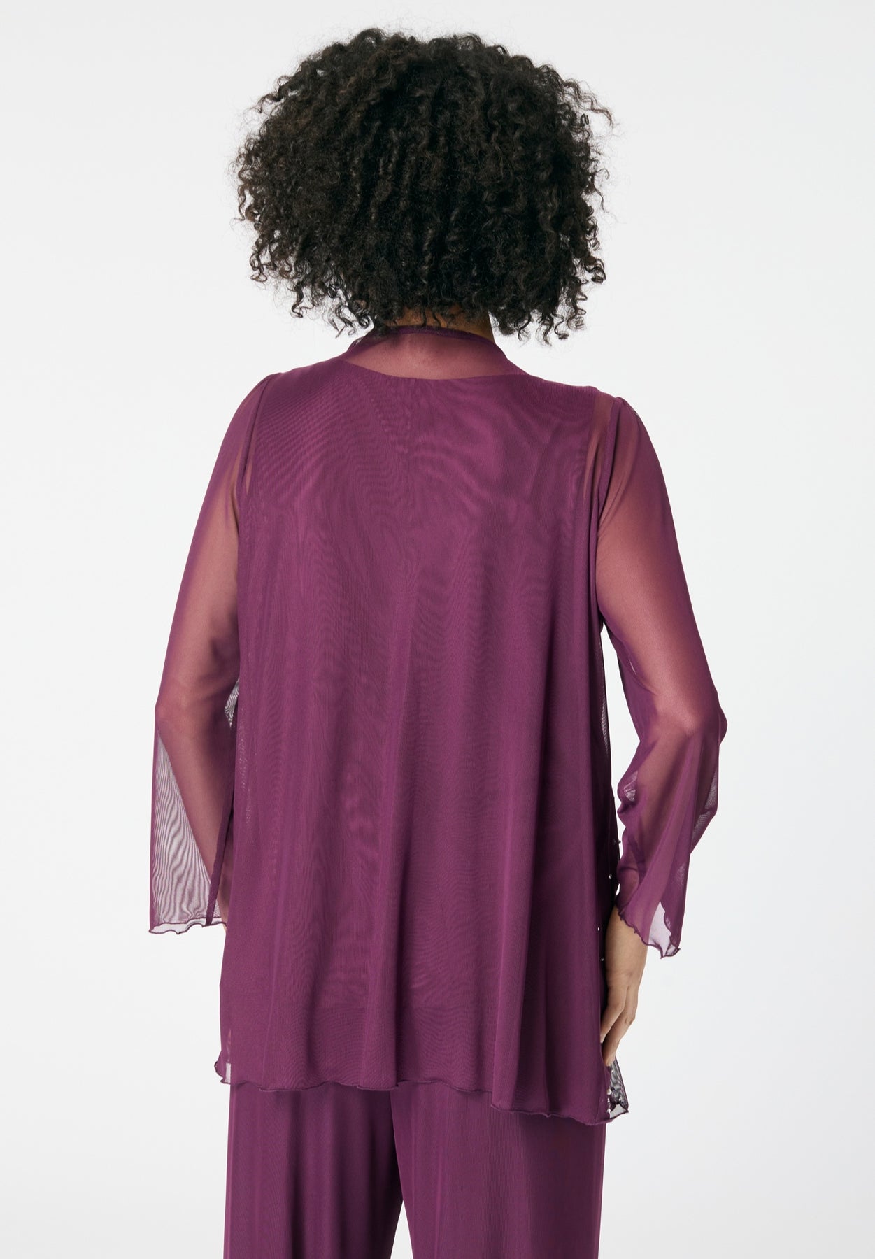 A scoopneck tank pairs effortlessly with a sheer mesh overlay cardigan, offering a stylish blend of comfort and sophistication. This set is great for layering and adding a light, airy touch to your look. Long sleeves.