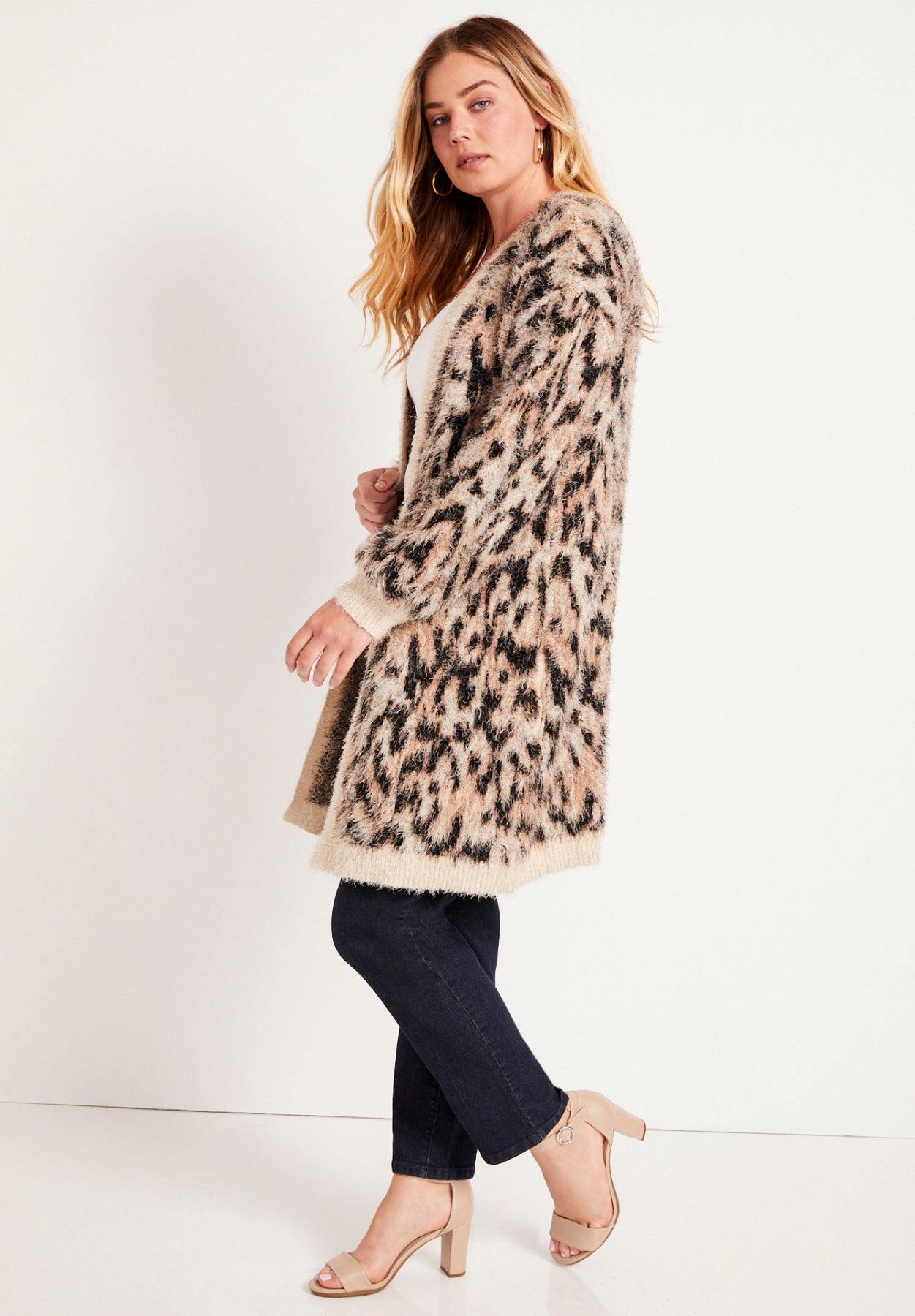 Get in touch with your wild(ly) soft side...this cardigan is defined by its chic leopard-print design and classic cardigan silhouette. It's made from signature eyelash fabric, which gives it an ultra-sumptuous feel and soft handle. Open front.