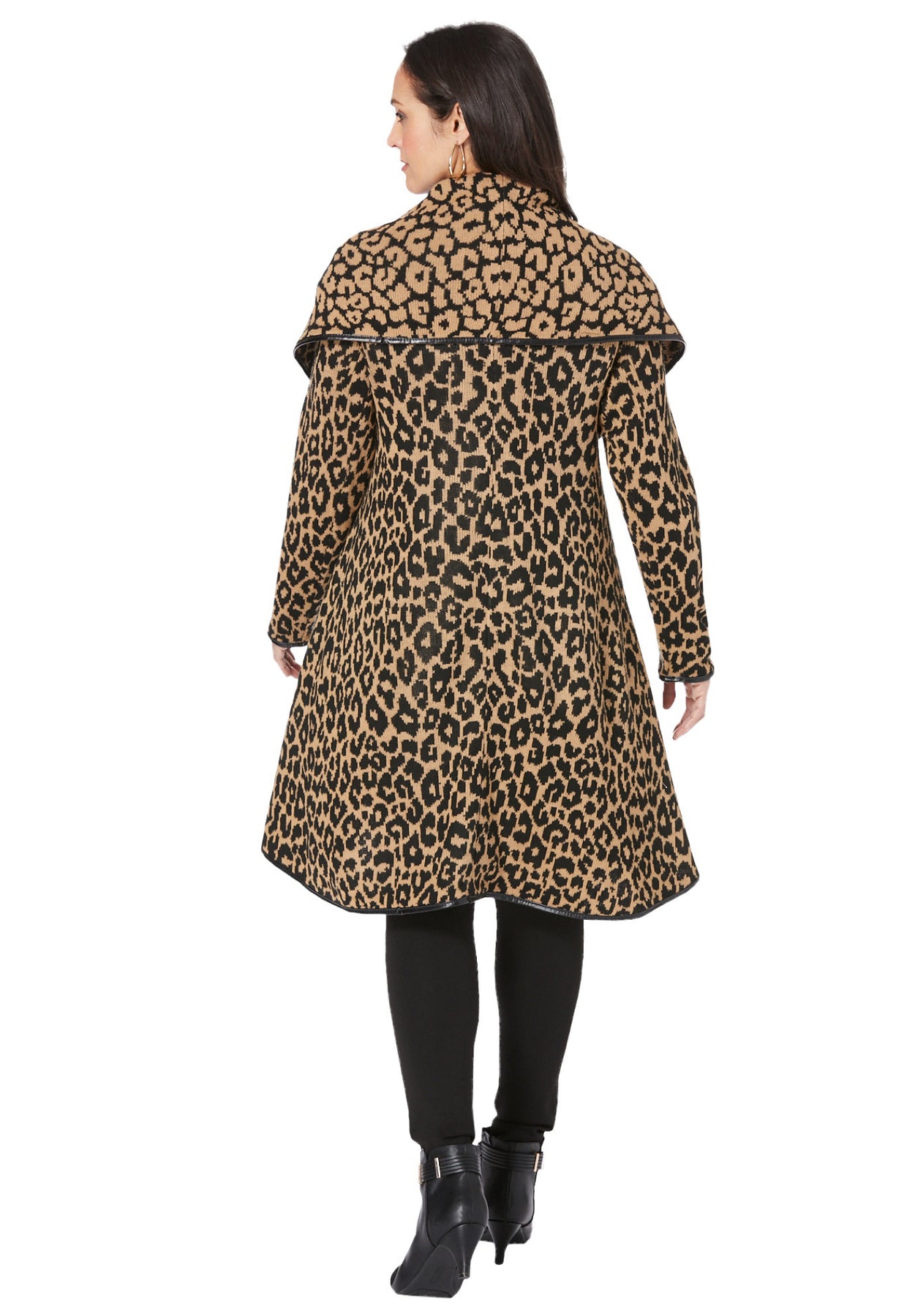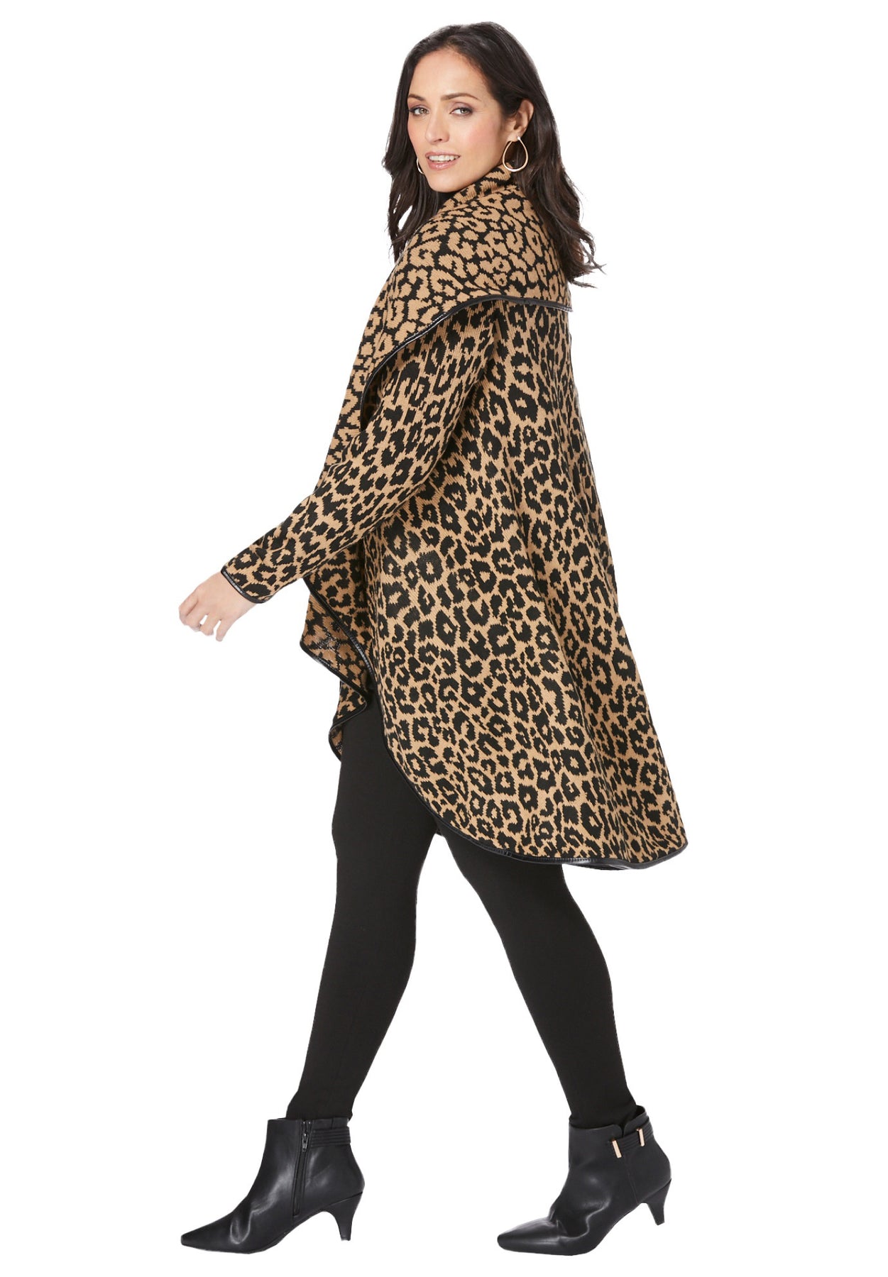 Cascading open-front sweater with faux leather trim. Long sleeves. Hi-low hem.