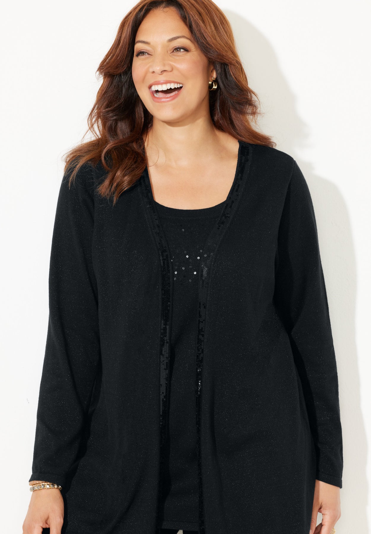 A busy social calendar needs a wardrobe with outfits prepared to go at moment’s notice. Enter our Sequin Trim Tank Cardigan Duet. The long sleeve cardigan is designed with a built-in scoop neck tank for a ready-made layered look. And the sequins are the detail that hits the elegant sweet spot, subtle and stunning. Try it paired with a polished pant such as our Right Fit® Pant.