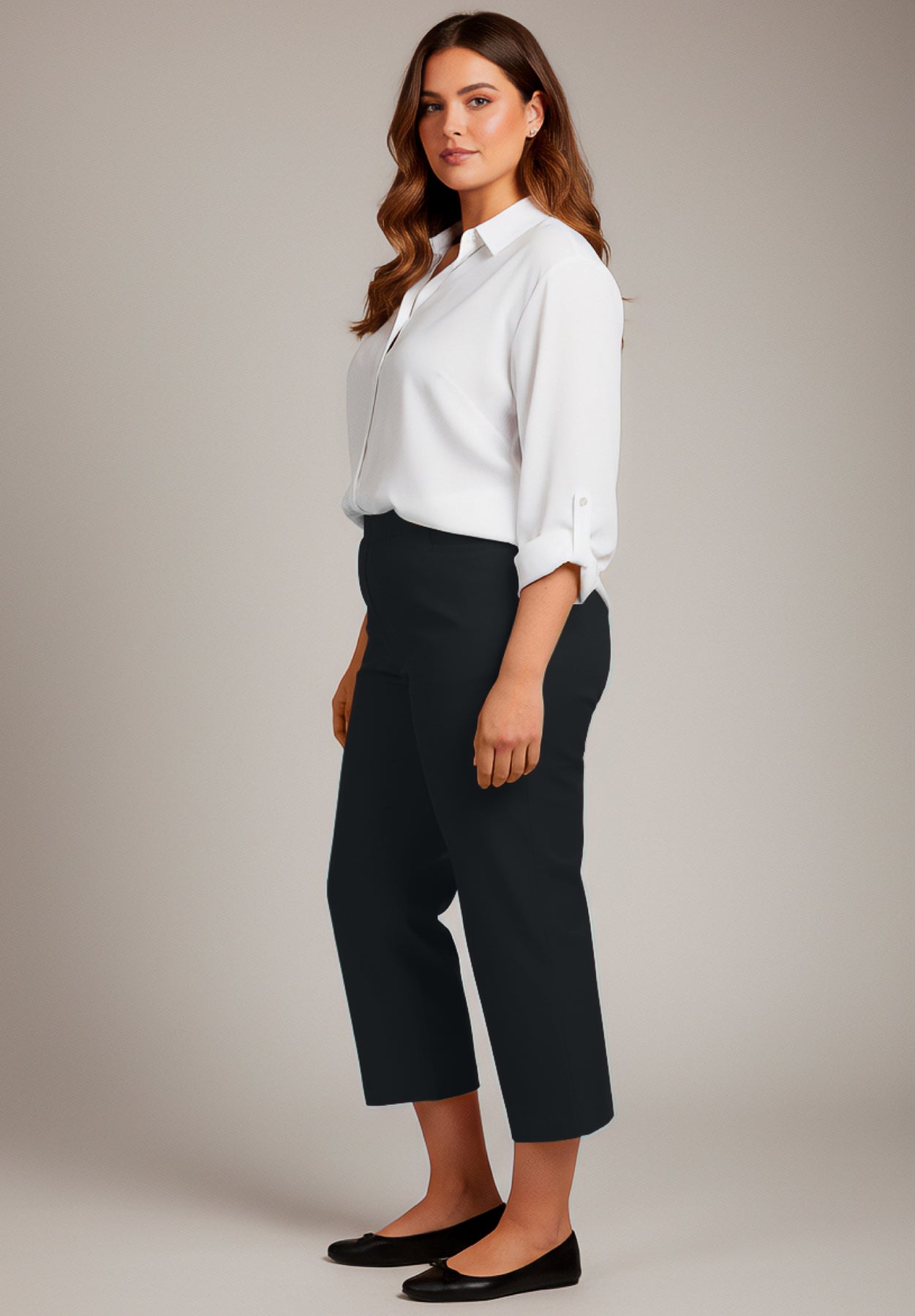 These super-stretch pull-on pants feature a smooth, easy fit with a clean straight-leg silhouette that hits at the ankle. Designed for comfort and flexibility, they offer a sleek look with faux pocket detailing and a streamlined waistband. Versatile and polished, they move effortlessly from workdays to casual wear.