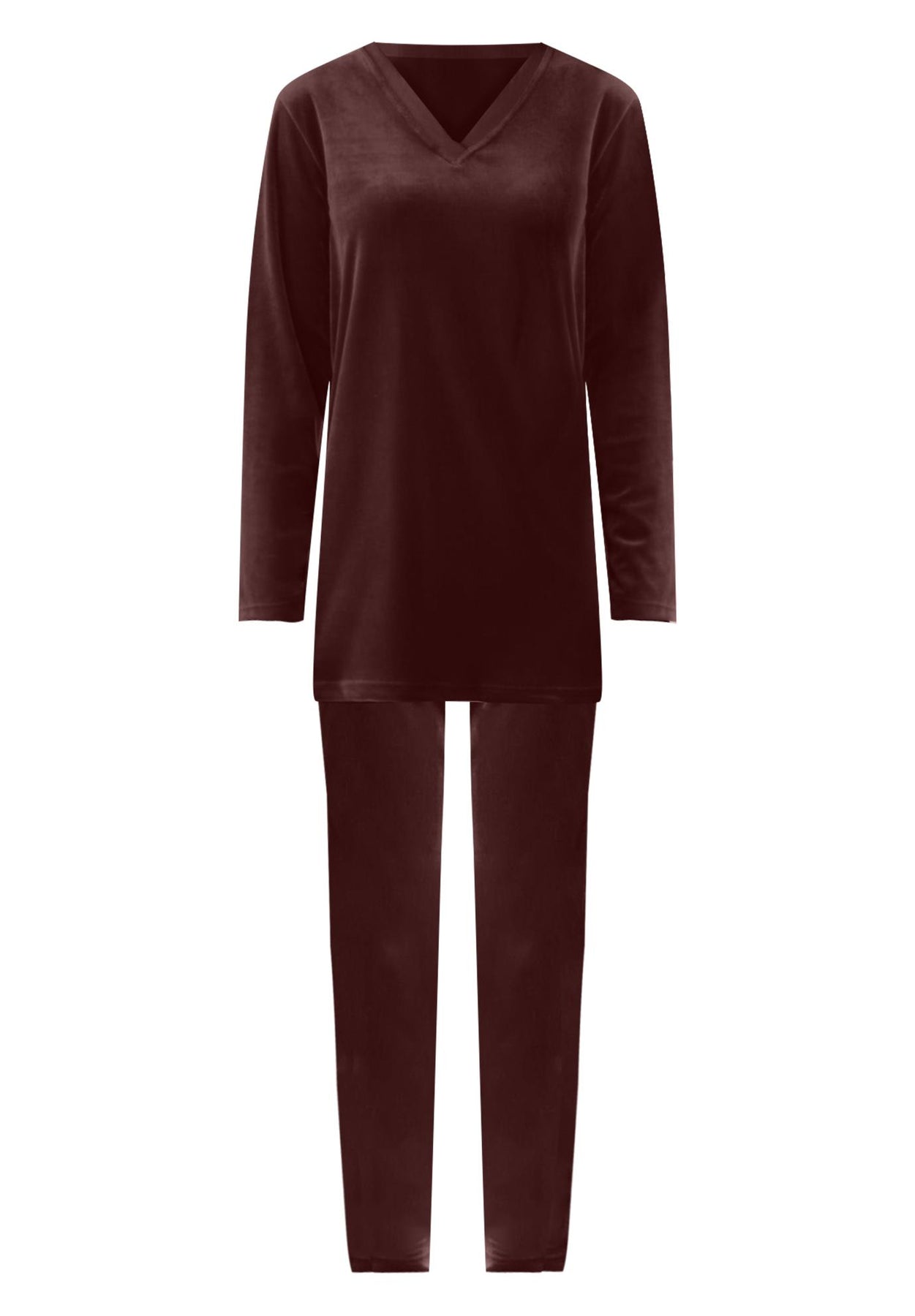 Lend a high-fashion feel to your cozy wear with this stylish velour set, featuring a V-neck tunic with cross-over details and elasticized straight-leg pants with side slits.