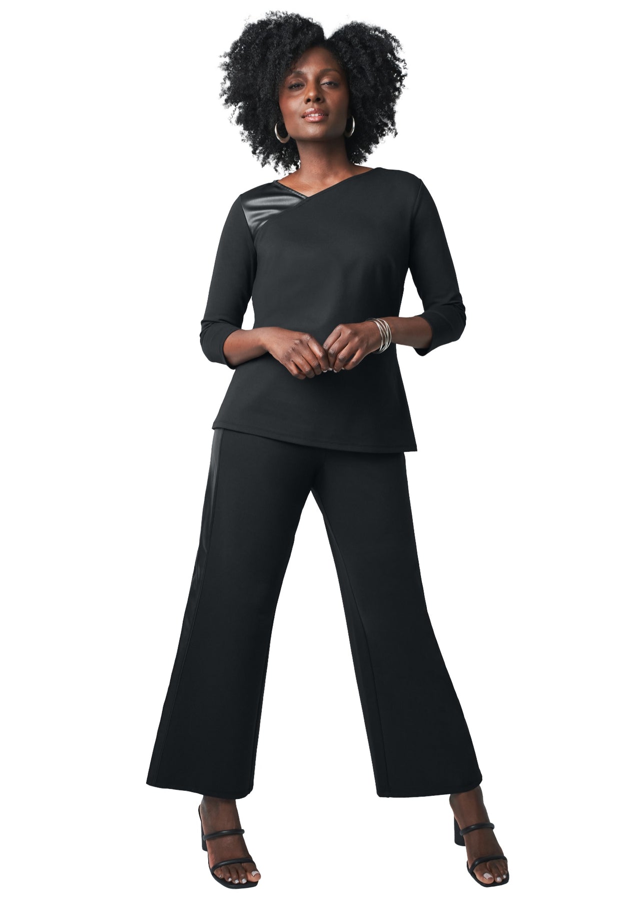 All-day comfort and elevated polish meet in this goes-everywhere Jessica London women's plus size Mixed Media Wide Leg Pant. The knit ponte fabric feels great all day, and faux leather adds an edgy touch to your everyday outfits. Pair it with our Mixed Media Top for a perfect outfit for work to weekend!