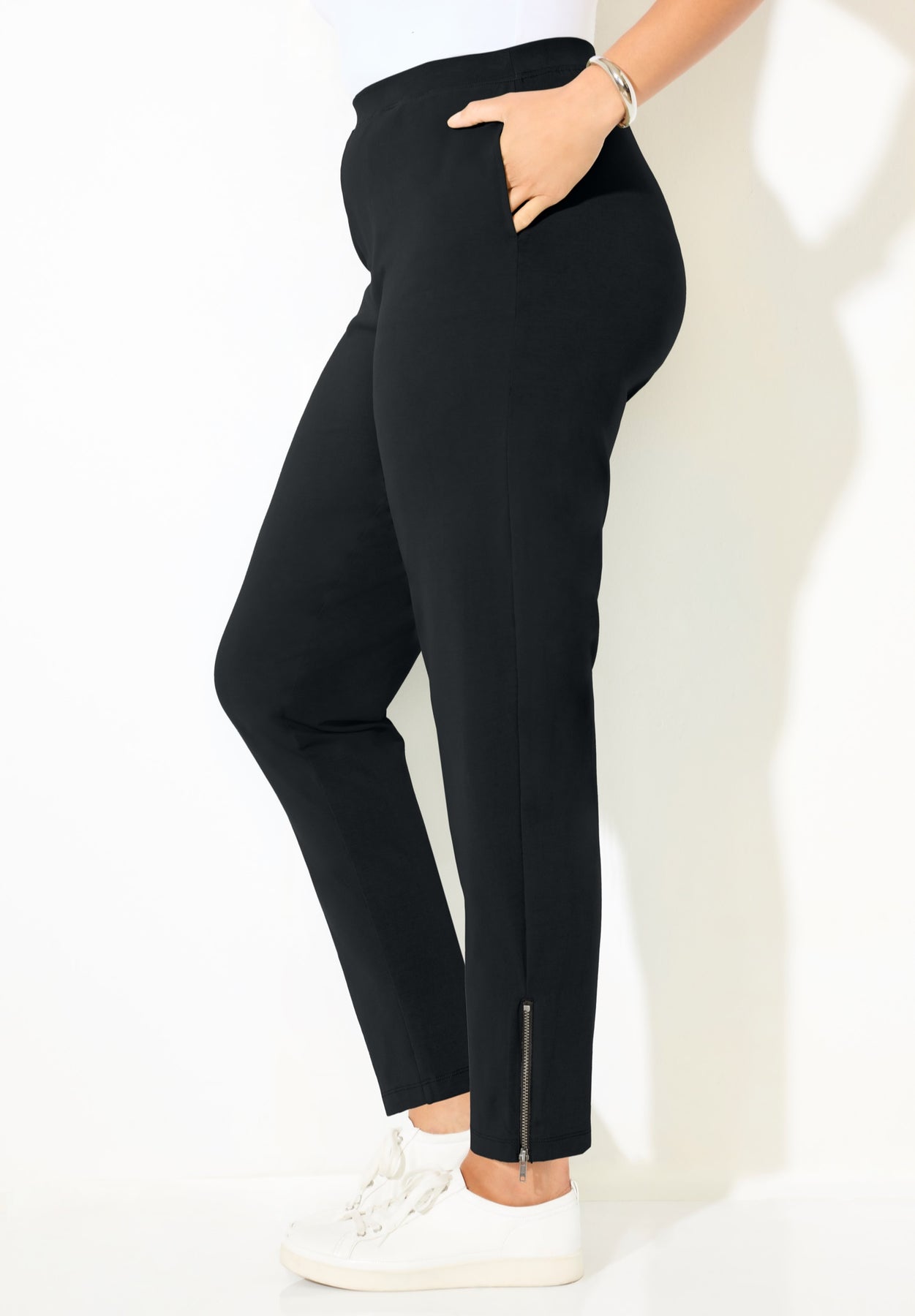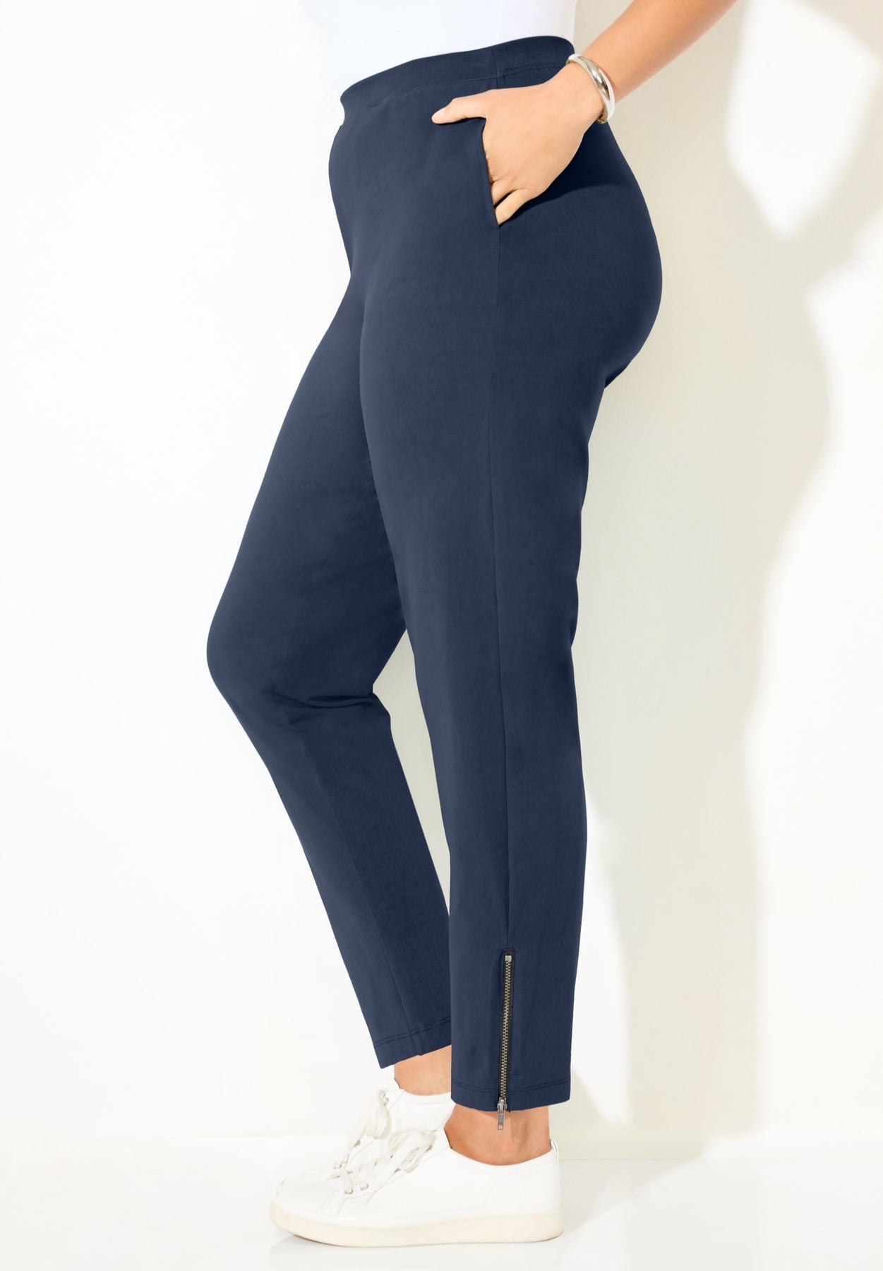 Our Slim Leg Zip Pant provides a sleek, streamlined look you'll love. This soft style has a zip accent at the leg opening to add a chic touch. Made of Suprema® stretch cotton, this pant hugs your body’s curves, moving with every twist and turn. Convenient side seam pockets. Pair with the Suprema® Studio Zip-Neck Tunic.