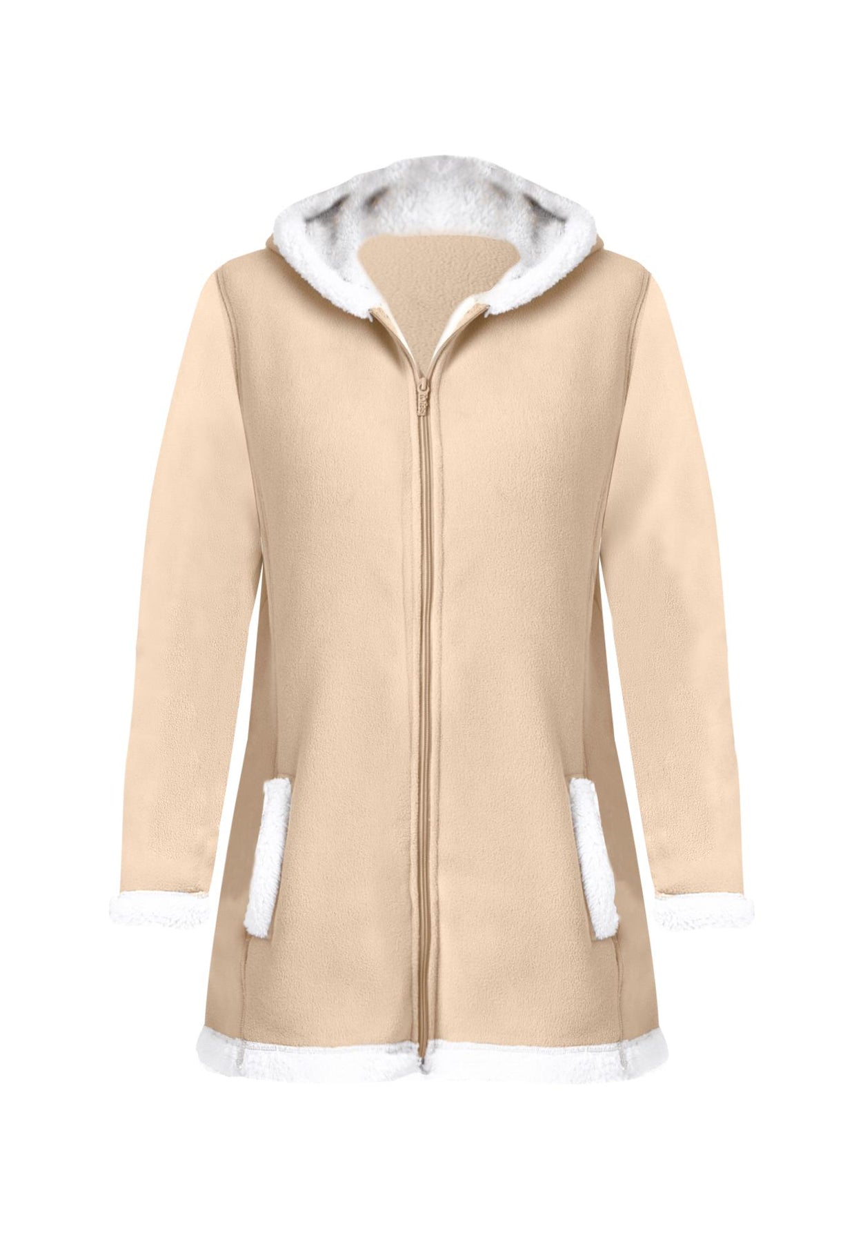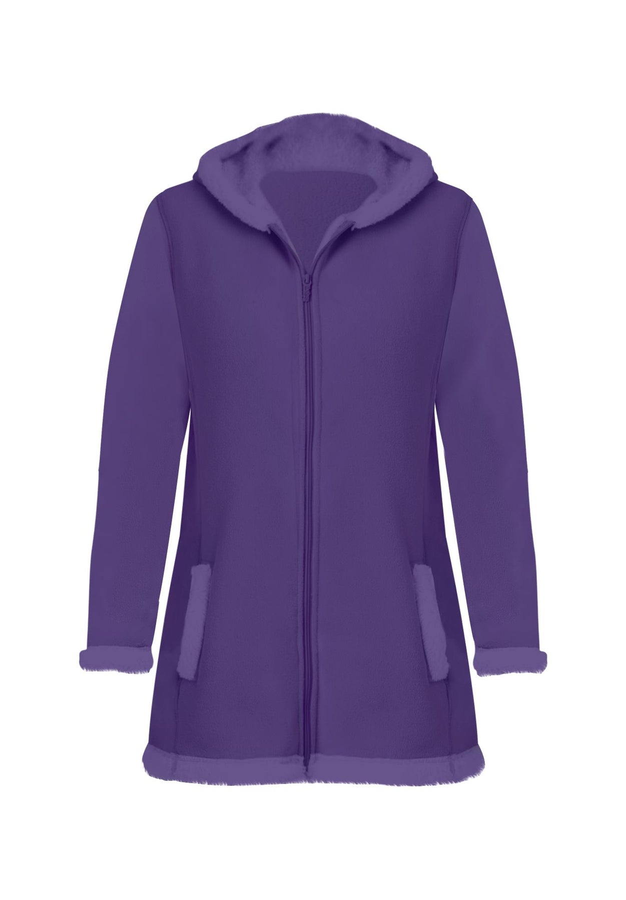 Stay cozy in our Fleece Sherpa-Lined Jacket. Cold-weather protection at its best with an attached hood. Zip front. Sherpa lining and trim. 32" length. Poly shell and lining.