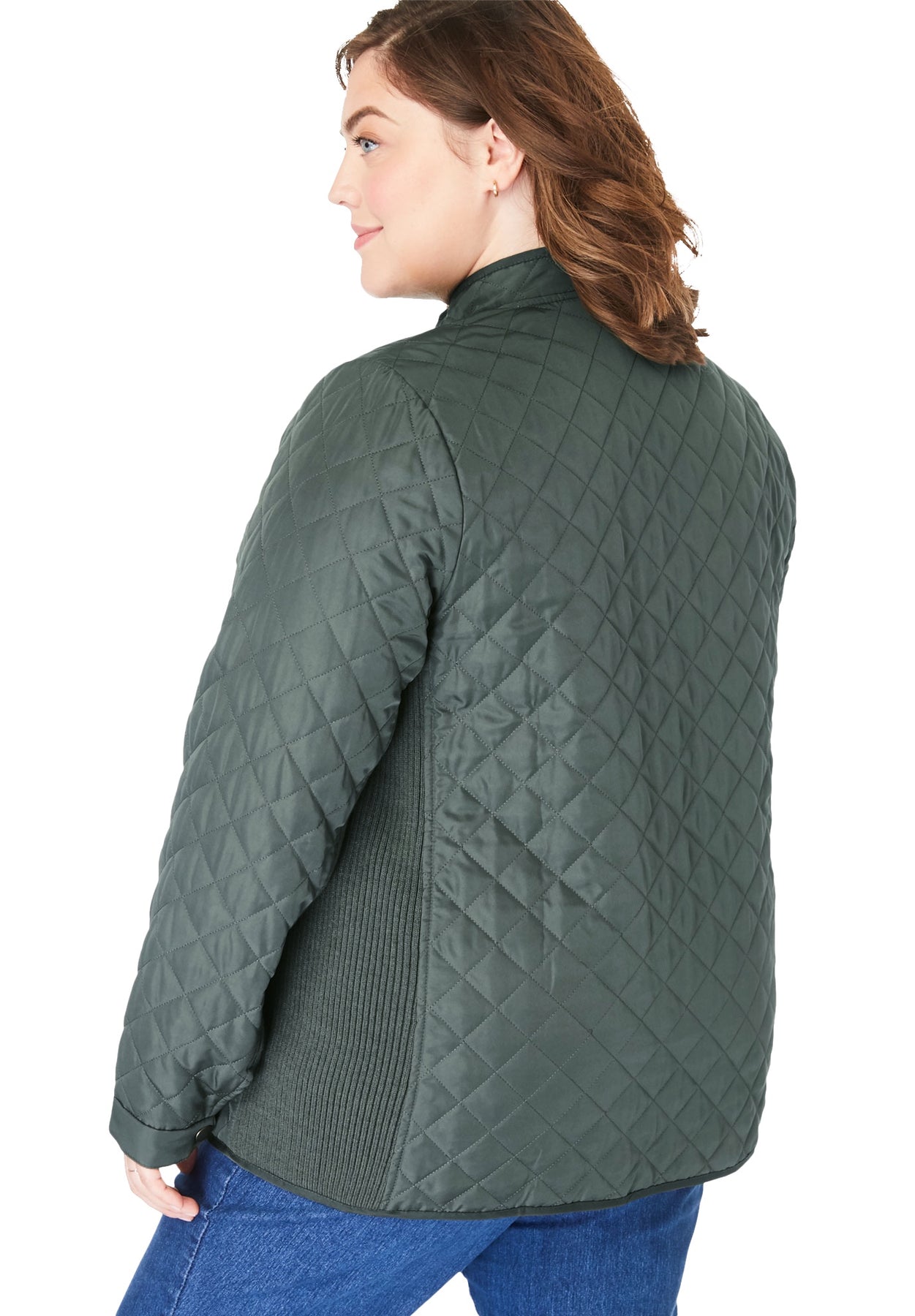 This quilted jacket is a must-have piece in your cold-weather wardrobe. Princess seaming and ribbed side panels create a lovely shape that contours to the body, and a zip front with stand collar keeps you nice and cozy.