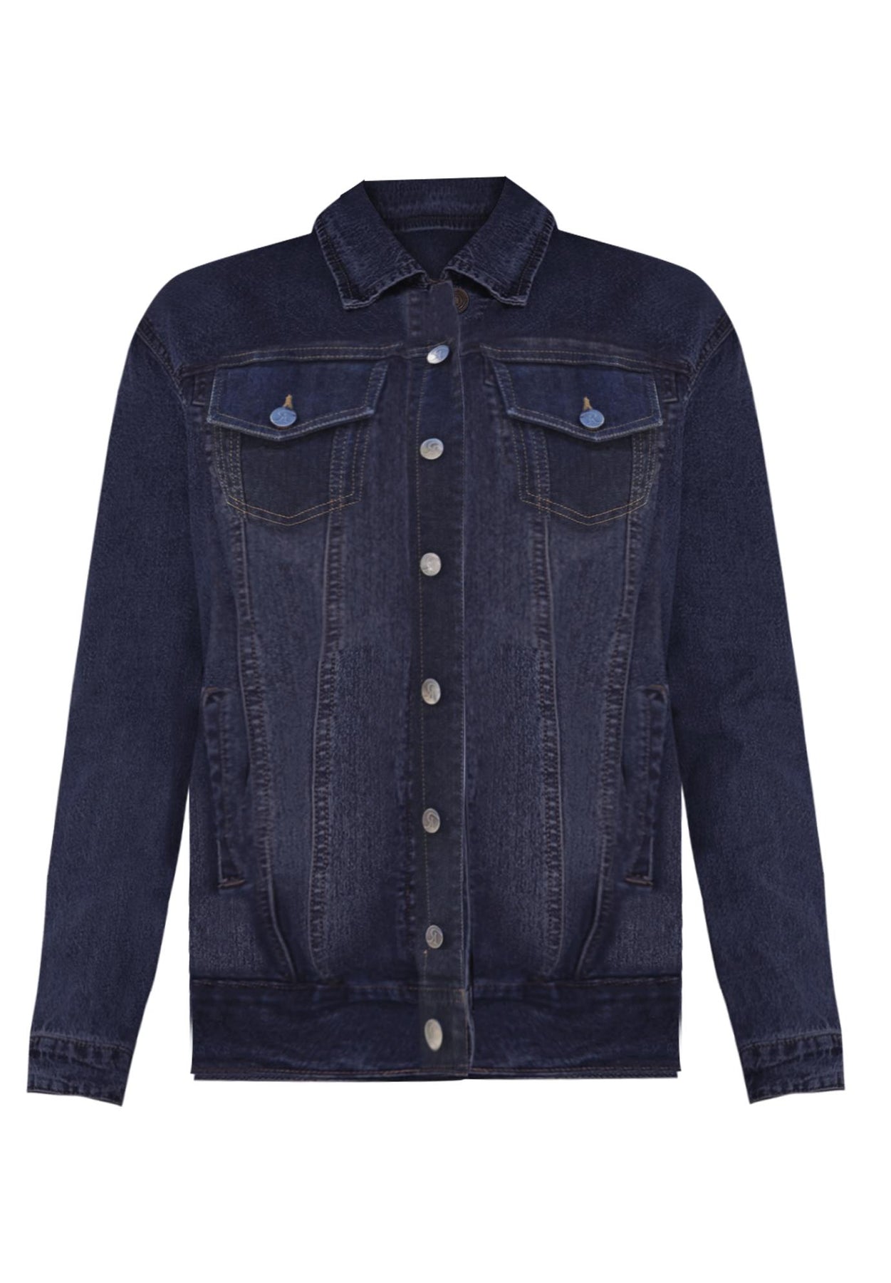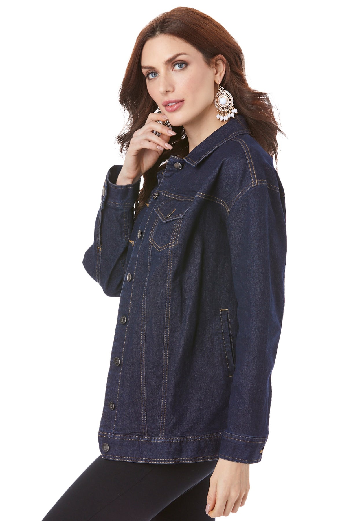 A versatile jean jacket updated with added length, making it an ideal pairing to wear with your favorite tunics. Made from easy, stretch denim, it's finished with a front button closure, buttoned flap patch chest pockets and side pockets.