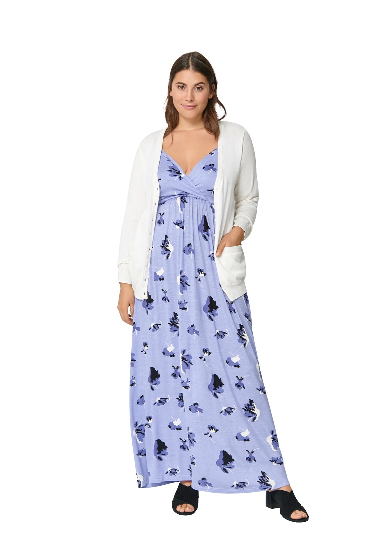 Maxi dress has surplice bodice and elastic empire seam with smocking at back. Adjustable straps.