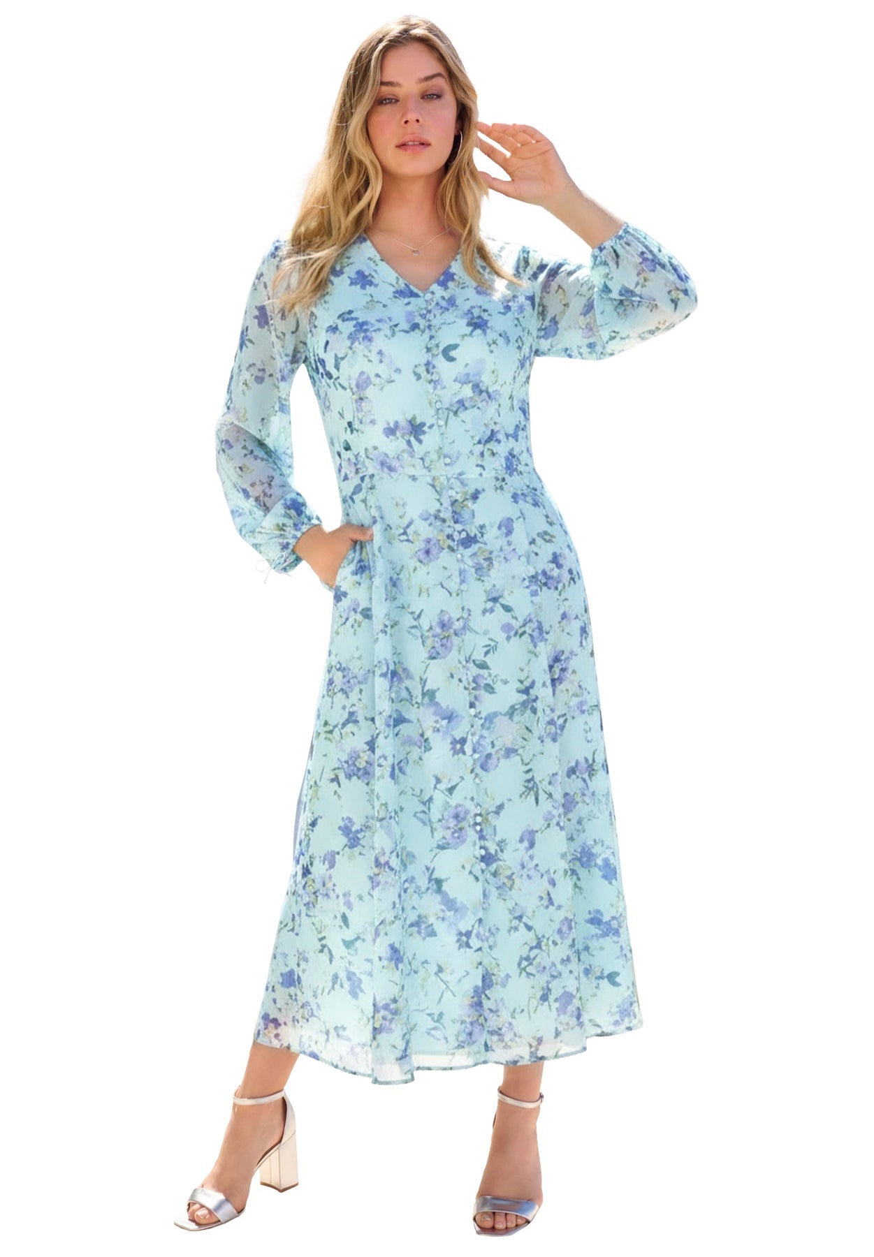 This boho-inspired maxi dress features a flattering V-neckline and 3/4-length blouson sleeves with elastic cuffs and faux tie details. Crafted from lightweight cotton, it offers a relaxed fit-and-flare silhouette, complete with side seam pockets and natural shell buttons for a touch of elegance. Perfect for any occasion, the dress effortlessly combines comfort and style.