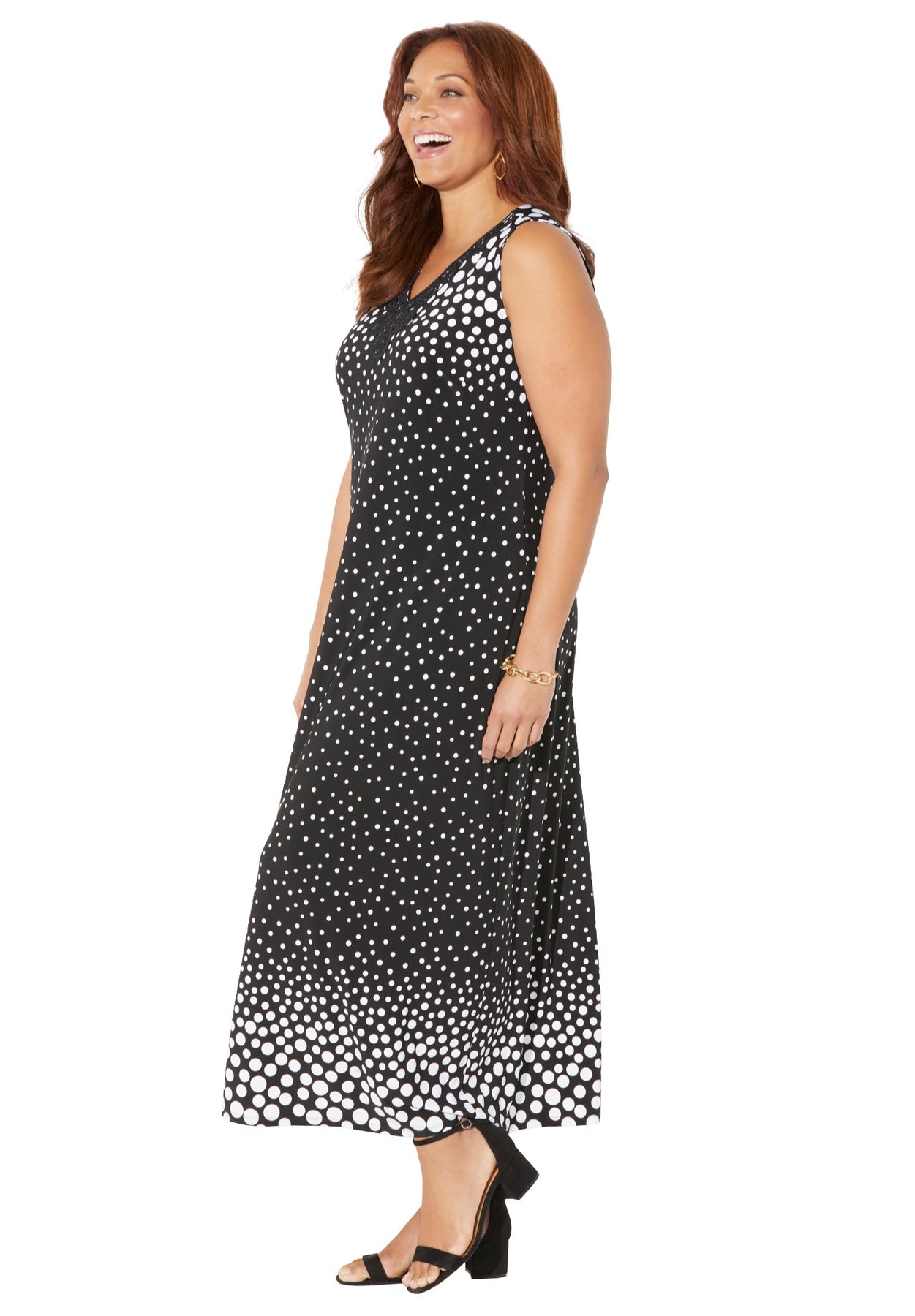 FIT: Everyone's favorite length for easy dressing and ultimate comfort, maxi dresses never fail to make a statement. Notch neck with crochet detail. Sleeveless. Bust darts provide shape and the perfect fit. No closure, easy pull-over style.