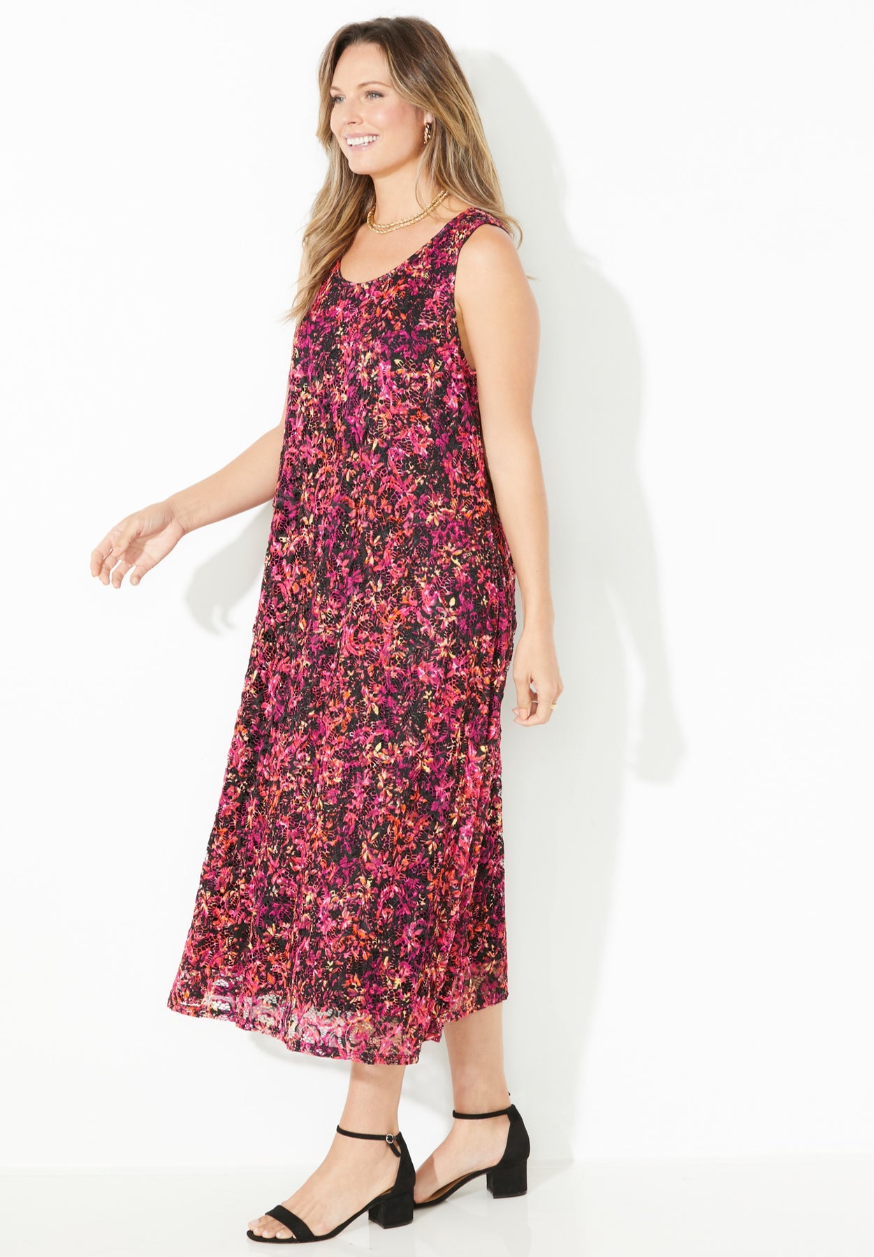 Talk about effortless style! Our sleeveless A-line dress is exquisitely crafted with allover stretch lace making it a show-stopping style for any dressy occasion. This flattering silhouette flatters every figure. Wear alone with strappy sandals or top it off with one of our breezy cardigans to complete your look.