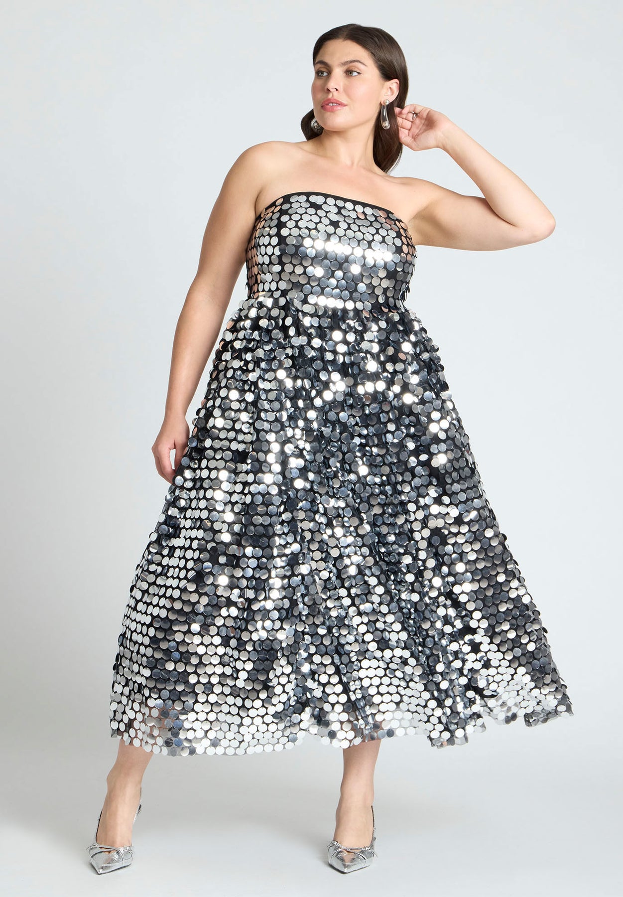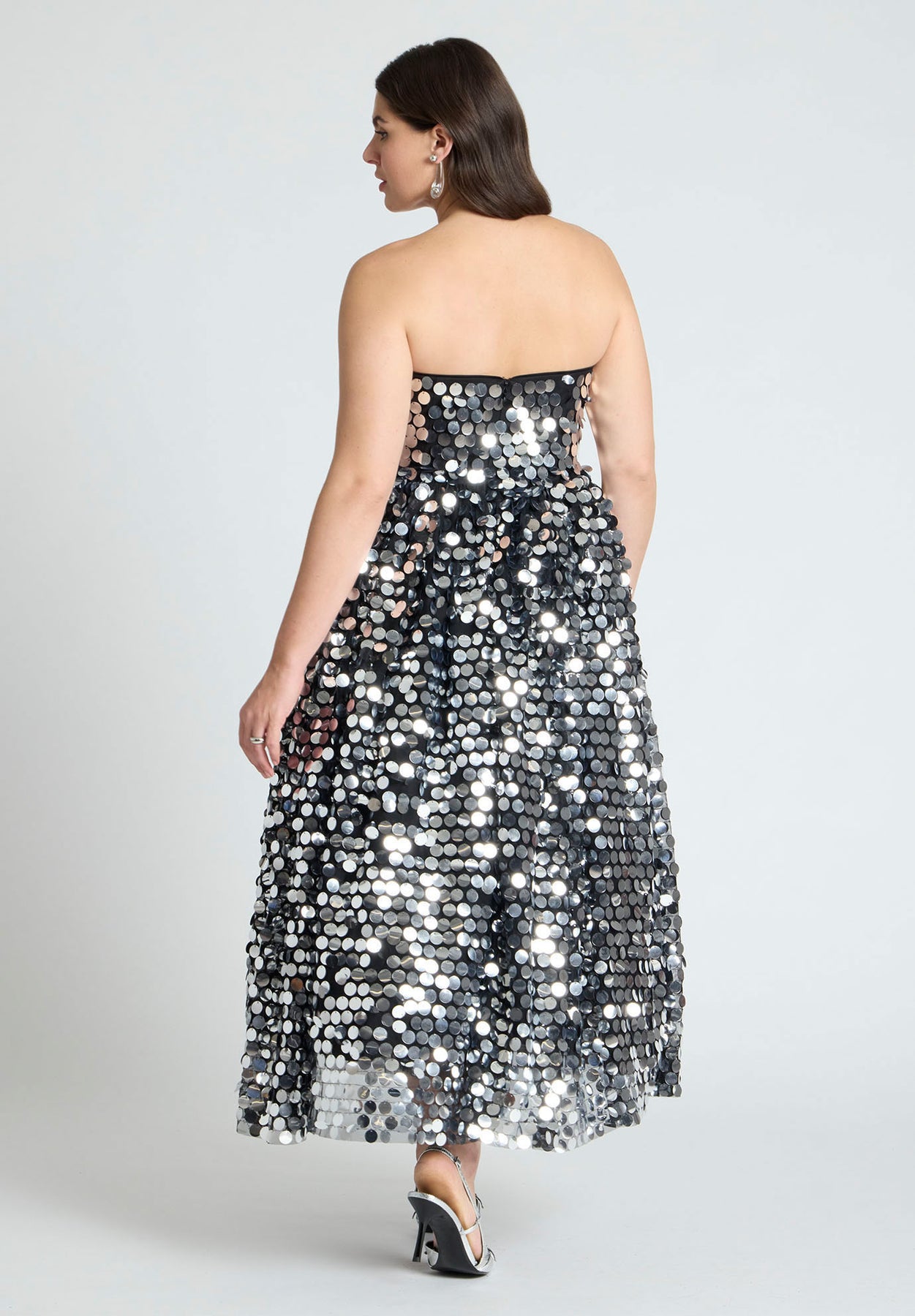 A celebration of sparkle, volume, & glamour, this head-turning strapless dress pairs a sculpting bodice with a crinoline-lined skirt that sways with every step. It was intentionally covered in sparkly paillettes to light up any dance floor, cocktail hour, or NYE bash.