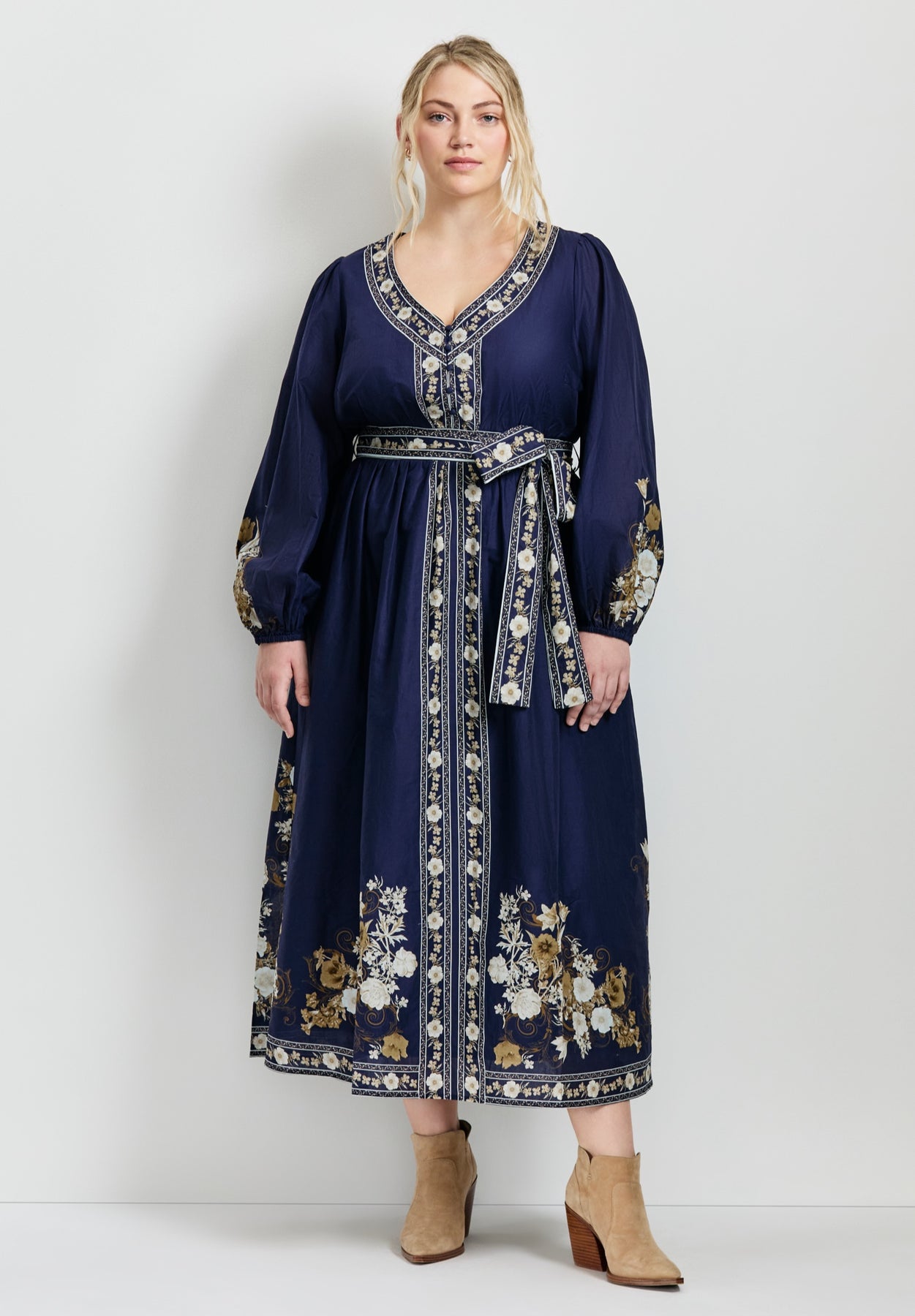 Introducing the Ethereal Escape Maxi Dress—the ultimate blend of comfort and style that's bound to become your new wardrobe staple! With its V-neckline button-through bodice and striking feminine print placement, this dress captures the essence of effortless elegance. Feel the magic of its blouson long sleeves with encased elastic that add a touch of whimsy while providing all-day comfort. Crafted from natural cotton, the full A-line skirt gracefully sways with every step, making you feel like you're walking on air. Whether you're headed to a garden party or a casual brunch, this maxi dress is your ticket to fashion paradise.