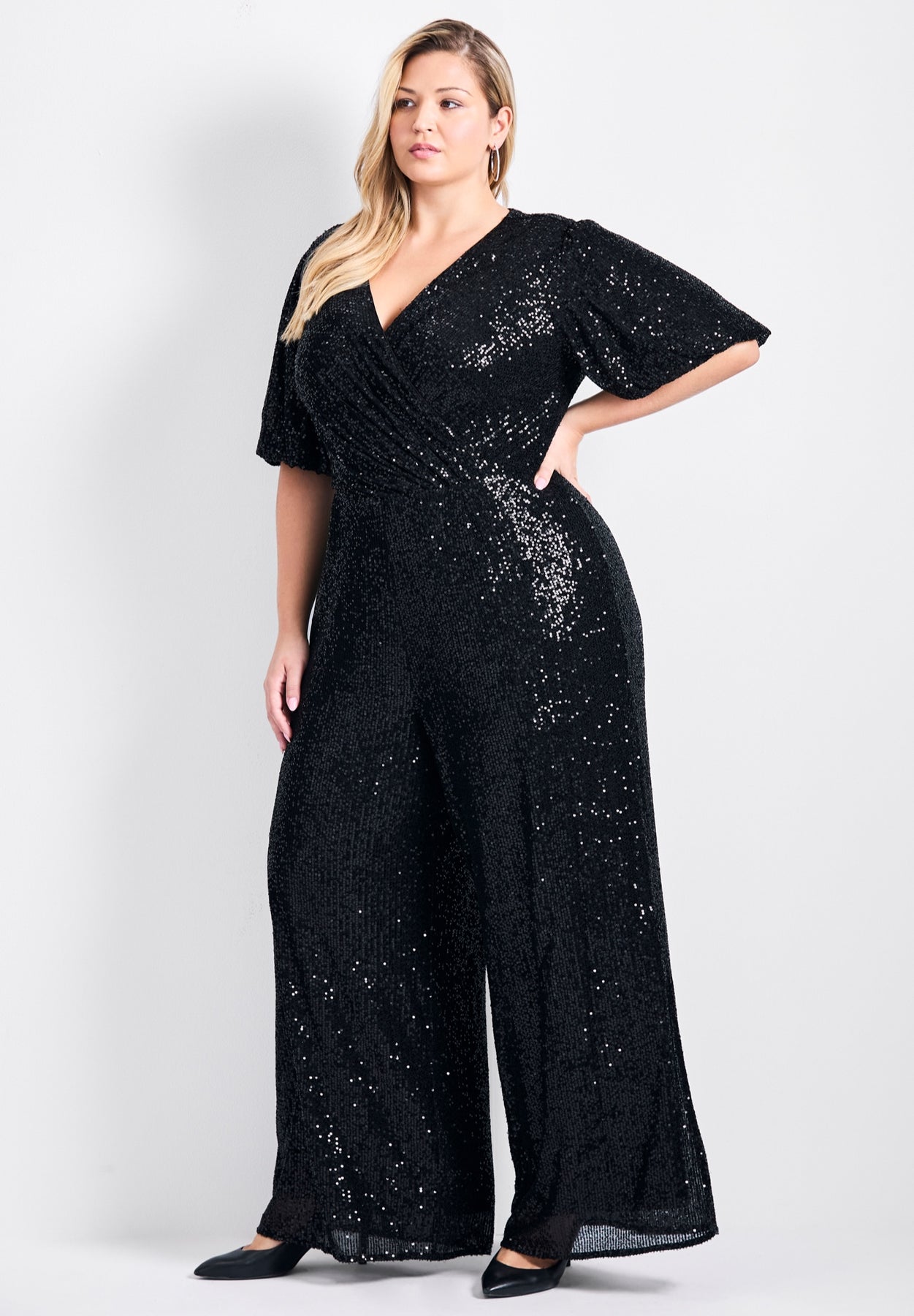 • Sequin wrap front jumpsuit with wide leg