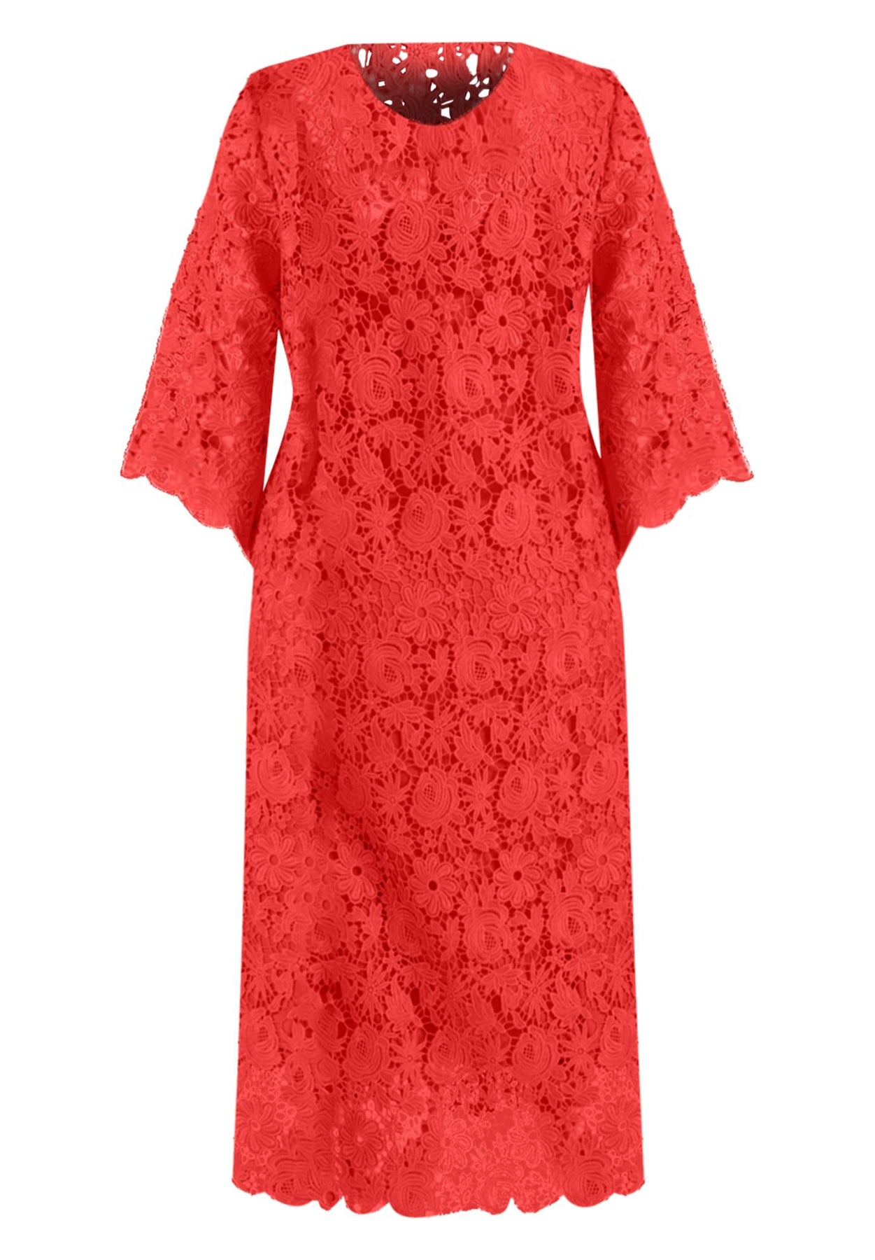 Feel fabulously feminine in this funky floral lace dress. With a simple scoopneck, this delicate midi dress features a detachable lining for easy wear. A straight silhouette balances the midi's bell sleeves, making for a versatile dress ready for any occasion.