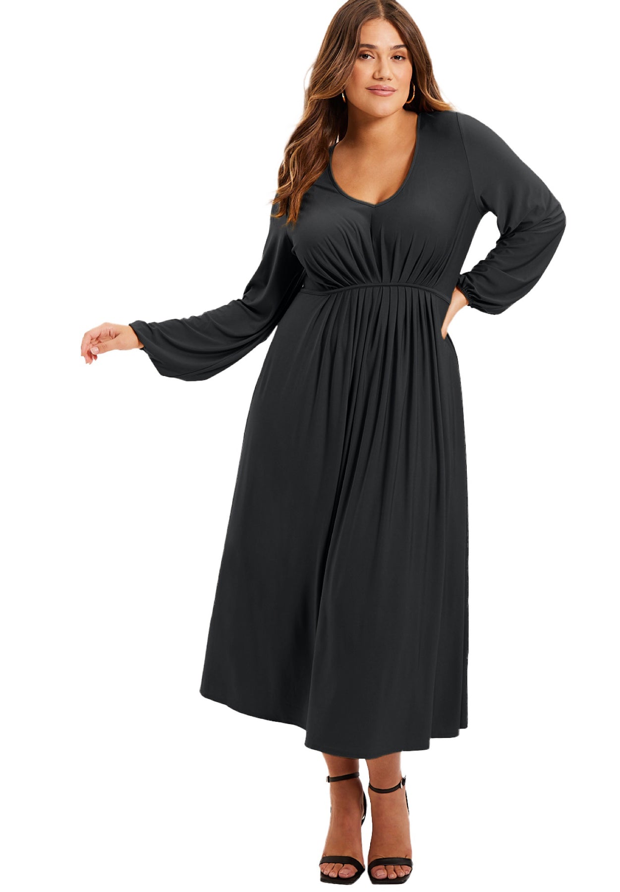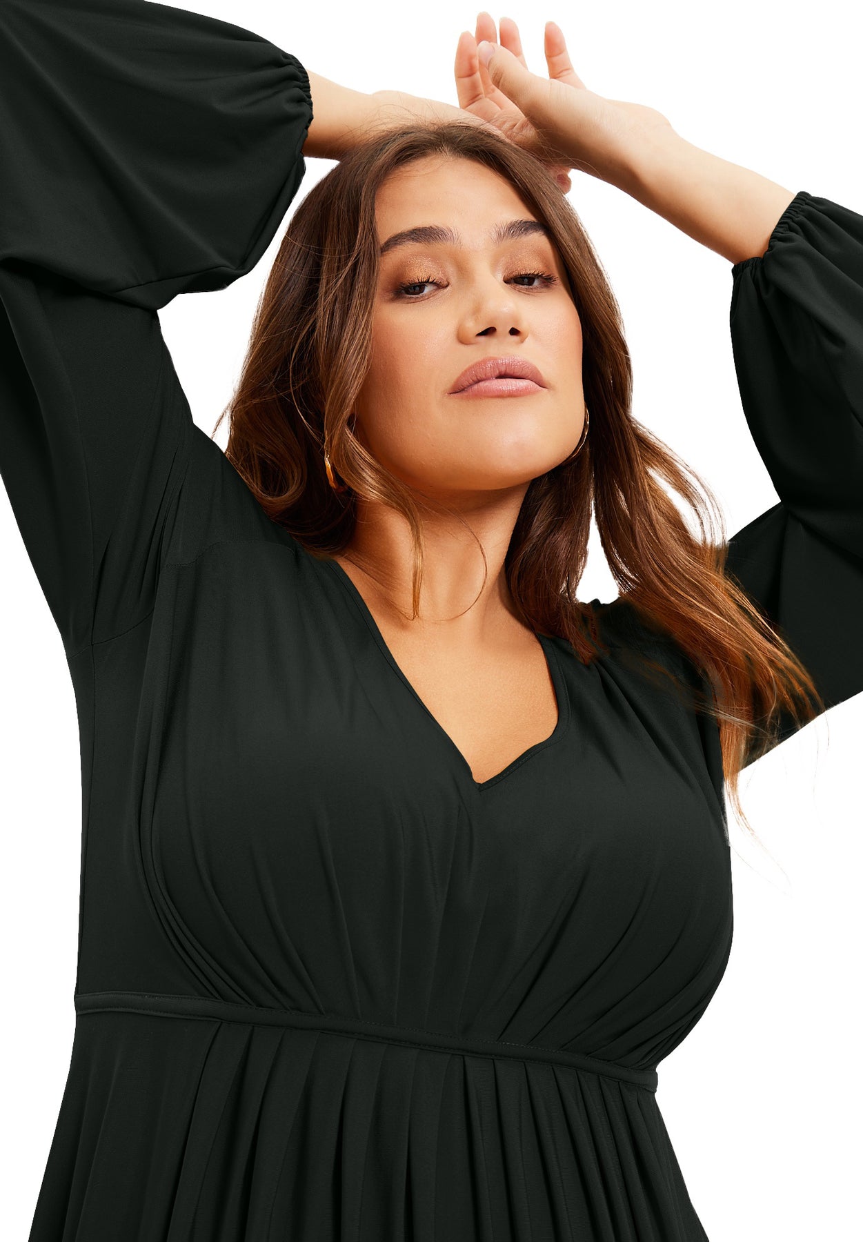 A silhouette that moves with quiet command, this softly structured dress is crafted from a fluid spandex knit—shaped by a plunging V-neckline and long, gathered sleeves that billow with graceful ease. Ruching beneath the bust defines the empire waist, lending delicate shape without restriction. Feminine yet grounded, it’s a lesson in bold serenity.
