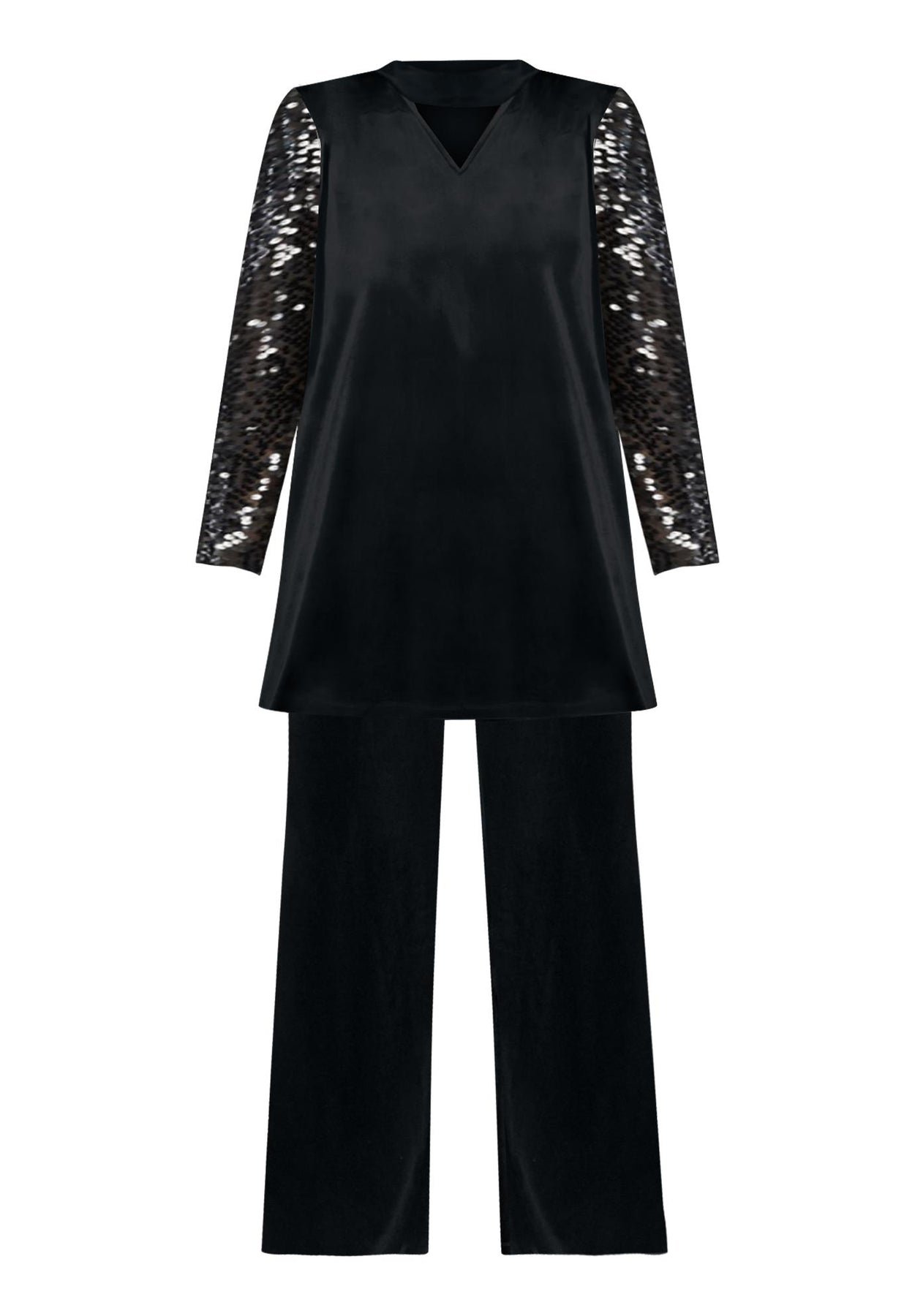 Get party-ready and go for a head-to-toe luxe look with this velour pant set. The velour's saturated color and slight sheen combine brilliantly with sequined bell sleeves and keyhole detail to offer fun and flirty appeal. Plus, the wider, subtly flared design and elastic waist of the pants keep you comfy the whole time.