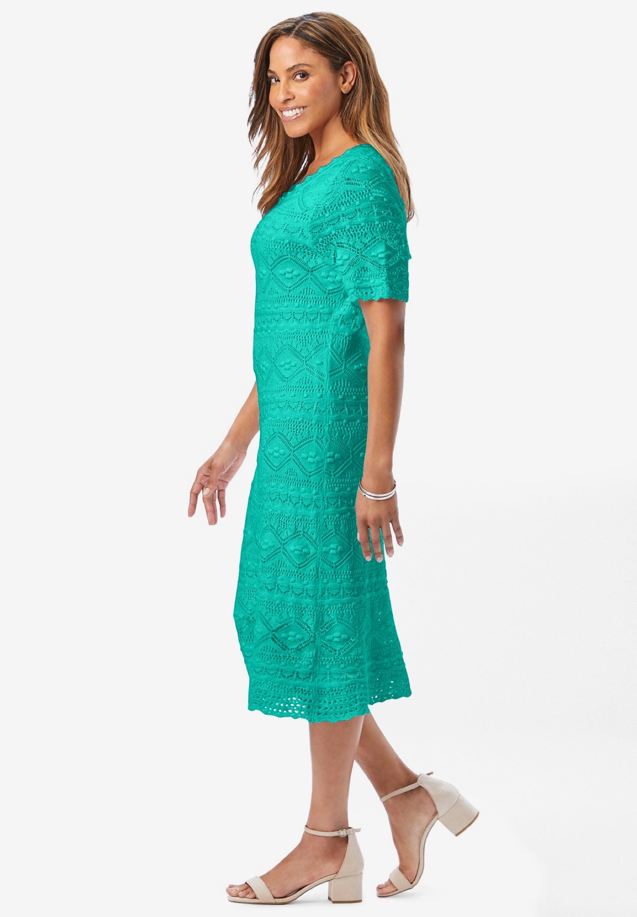Feminine, flattering, and oh-so-fun, this dress is a perfect fit for a day that takes you from desk to dinner. Scalloped crochet edges on the neckline, cuffs, and hem elevate this classic silhouette.