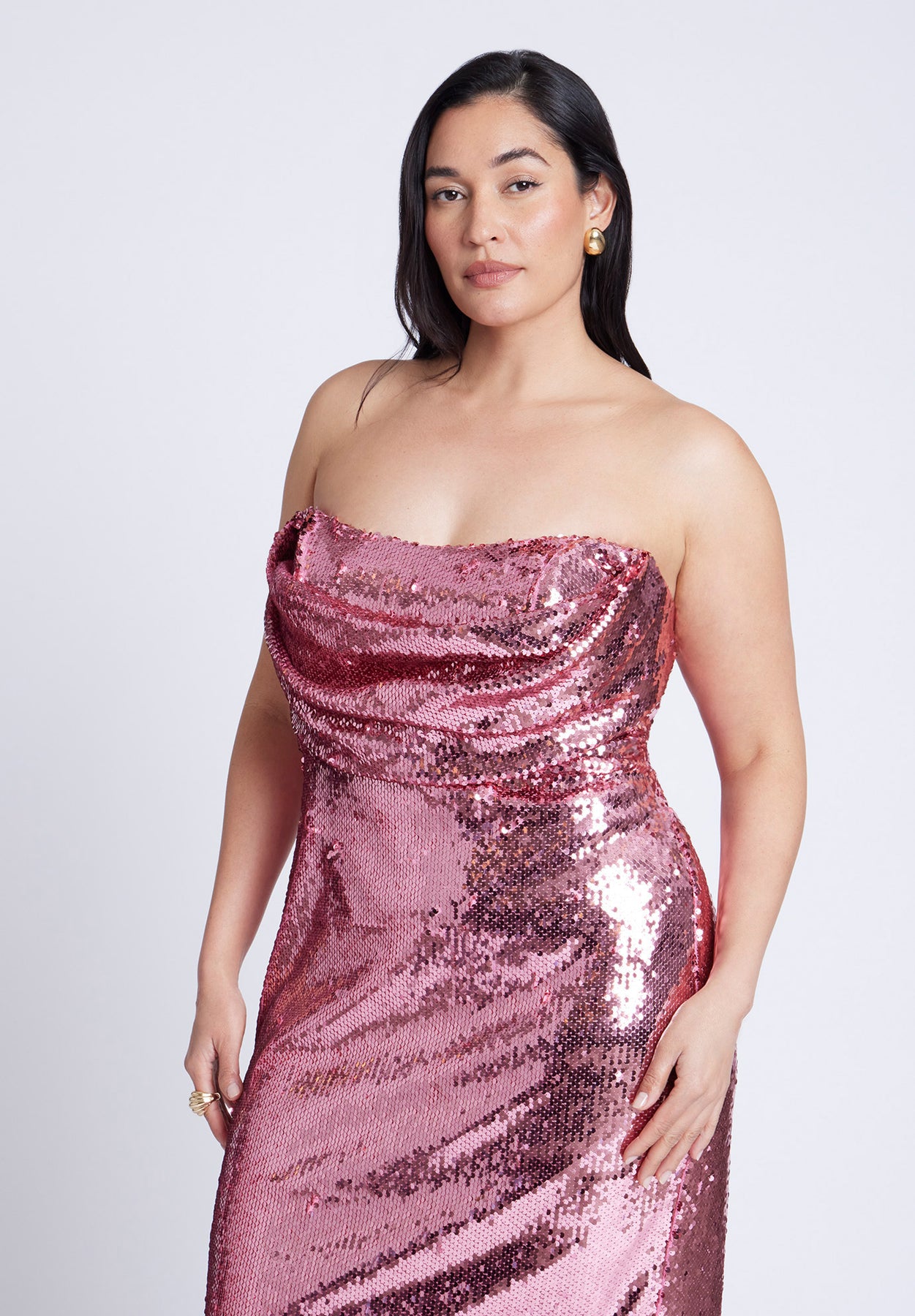 - Draped neckline with back zipper