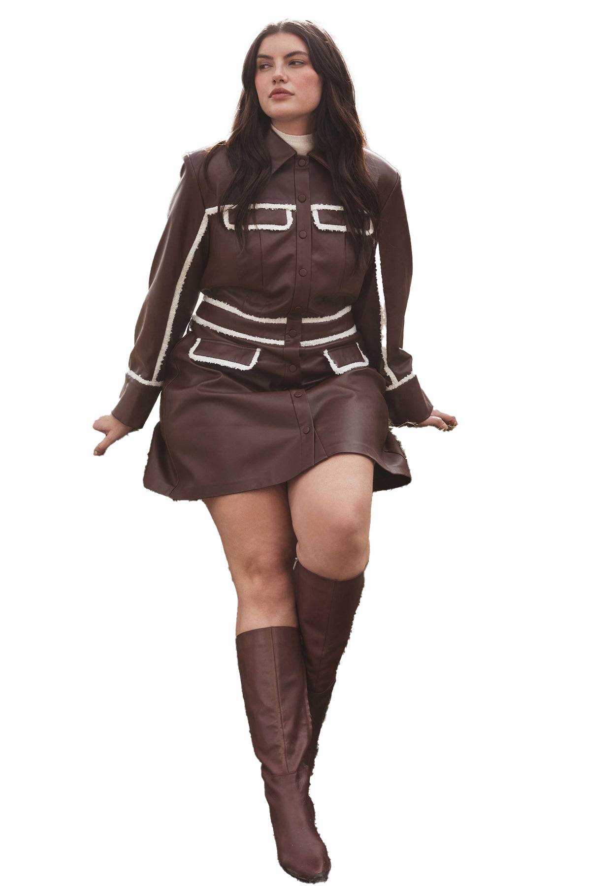 Step into modern contrast with this faux-leather mini shirt dress framed with soft sherpa trim. The mini length and structured silhouette deliver bold, cold-weather charm.