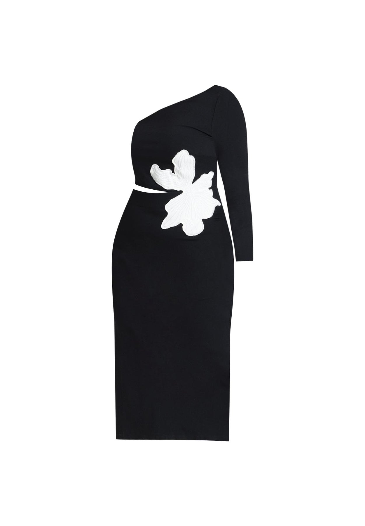 Named after its artfully stitched appliqué detail, this one-shoulder midi dress is a love letter to your curves. Cut from stretch-ponte, it features a bold asymmetric neckline, side cutouts, & a back slit for added mobility. Wear yours for girls' night out.