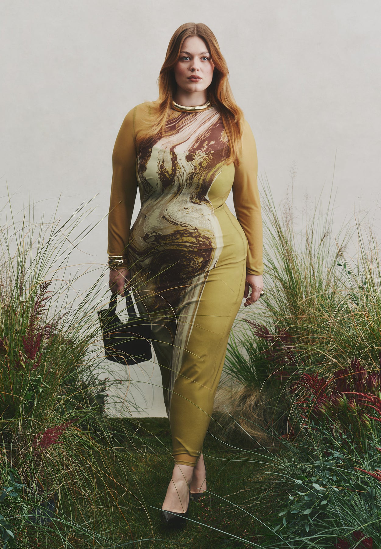 Step into sleek confidence with this printed mesh maxi dress that contours the body beautifully. A sheer overlay and adjustable slip lining create ease of wear and subtle dimension.