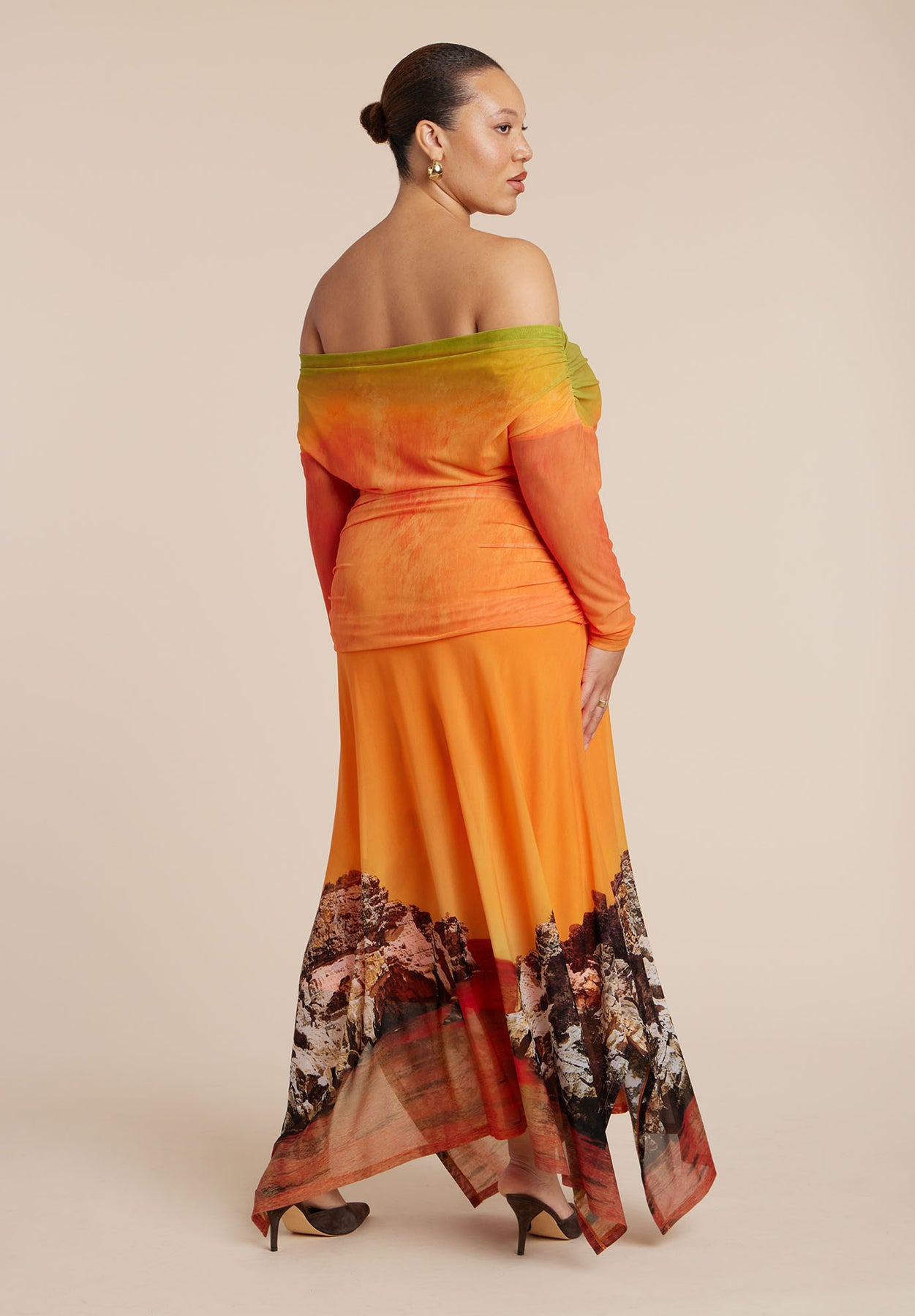 Turn heads in this photo-real mesh maxi dress designed for dramatic impact. An off-shoulder neckline and sharkbite hem create bold, modern allure.
