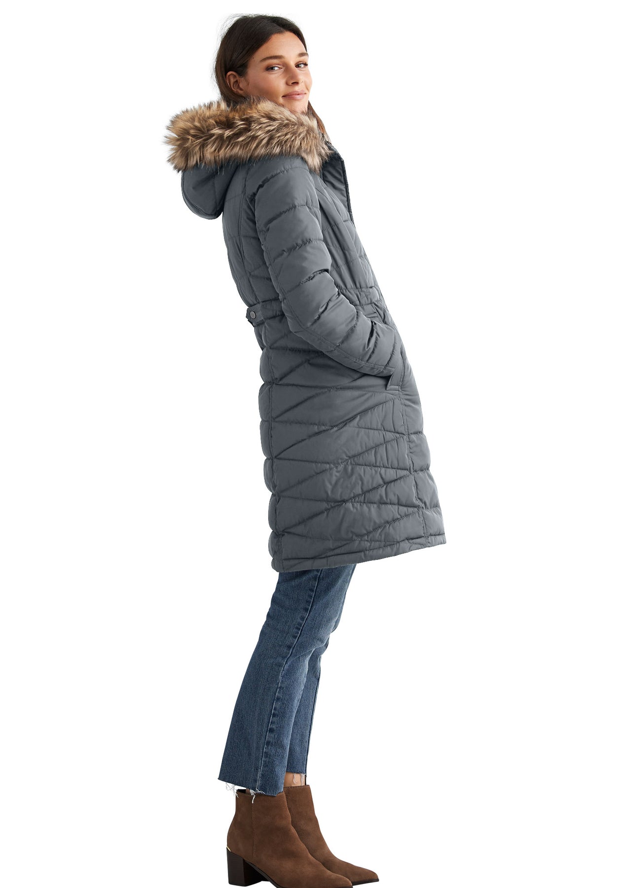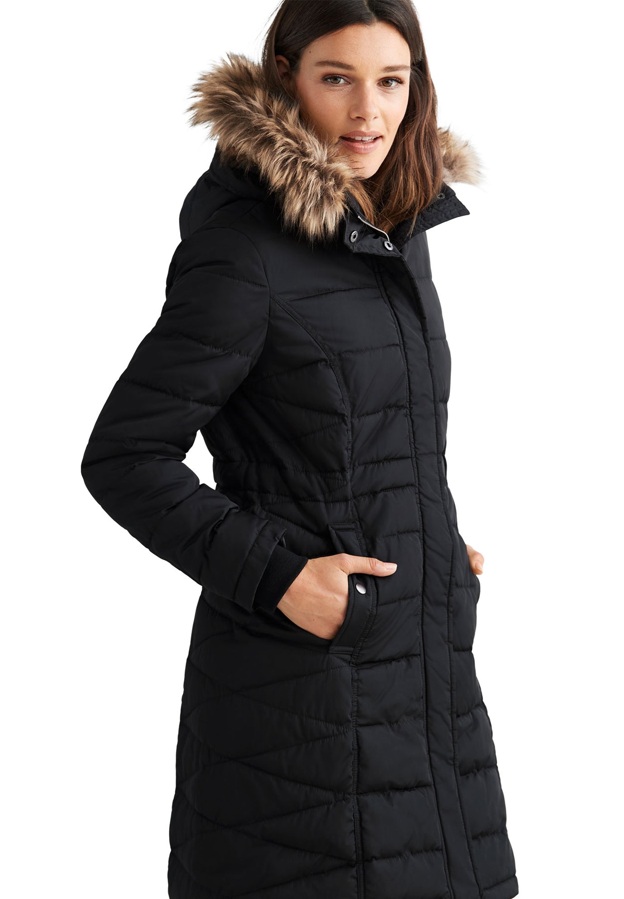 Coat to covet! This faux-fur trim puffer has shaping seams & an adjustable elastic snap for definition — The perfect blend of form and function.